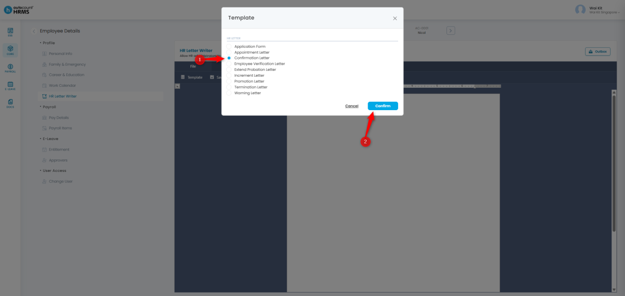 4. A template selection panel will appear. Select your preferred template and click Confirm to generate the letter.