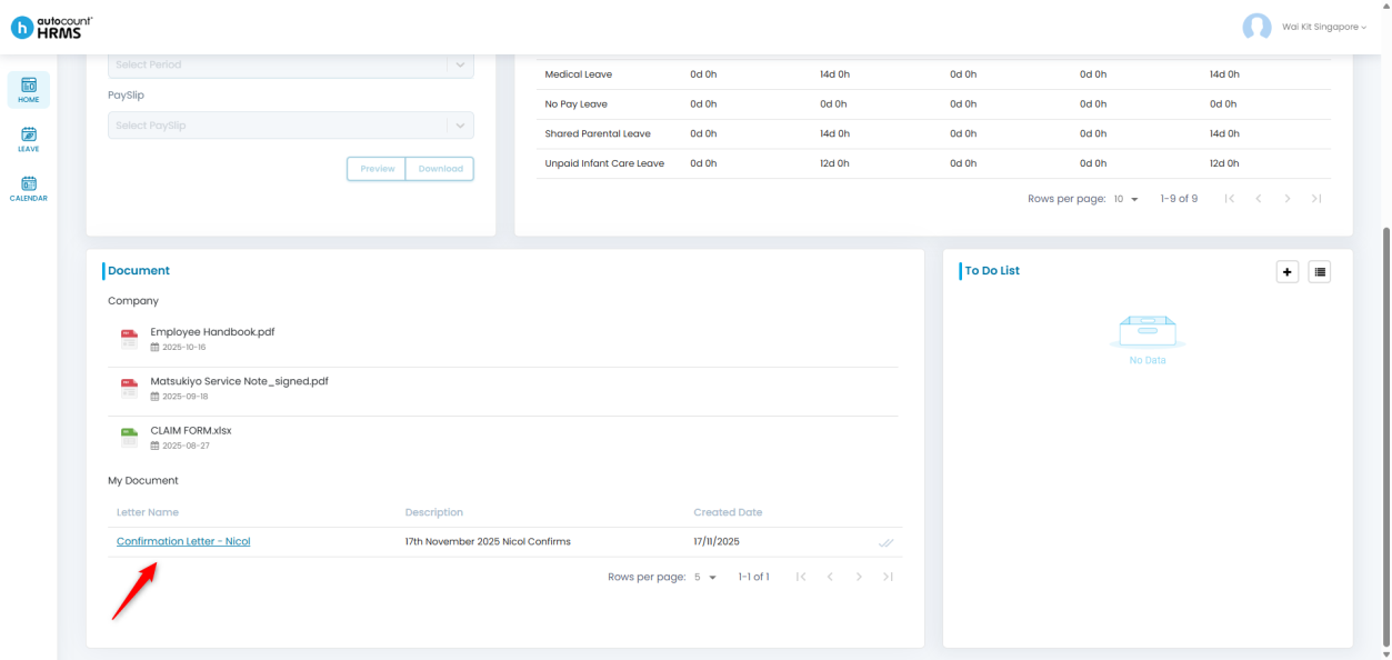 9. The employee can view the letter under Home > My Document, click the letter and then click Acknowledge to acknowledge receipt.