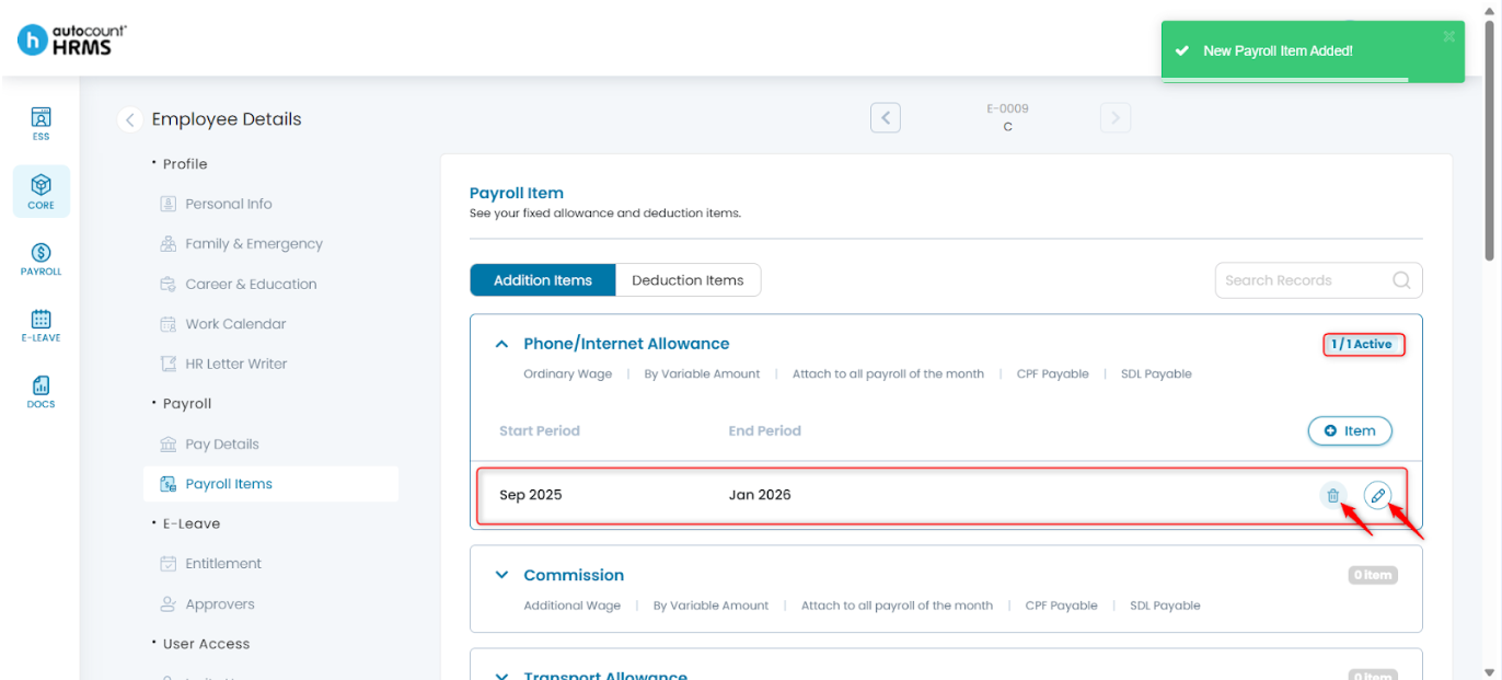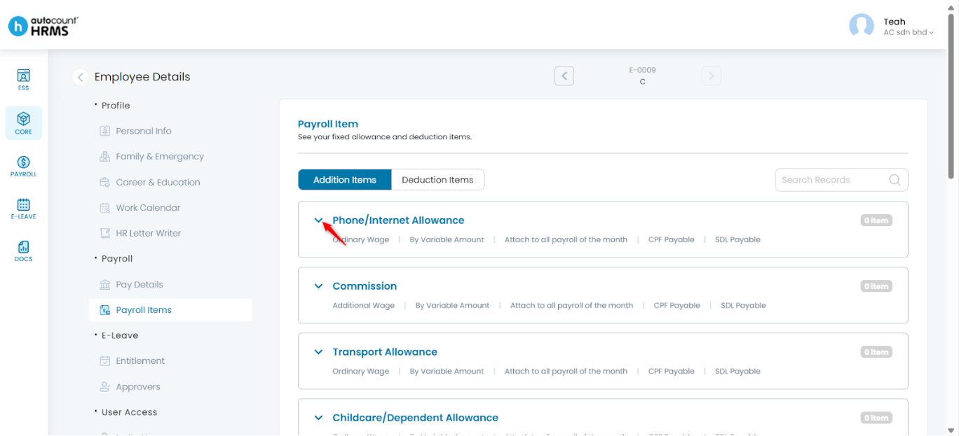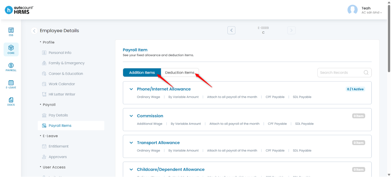 5. Navigate to Addition Items or Deduction Items accordingly.