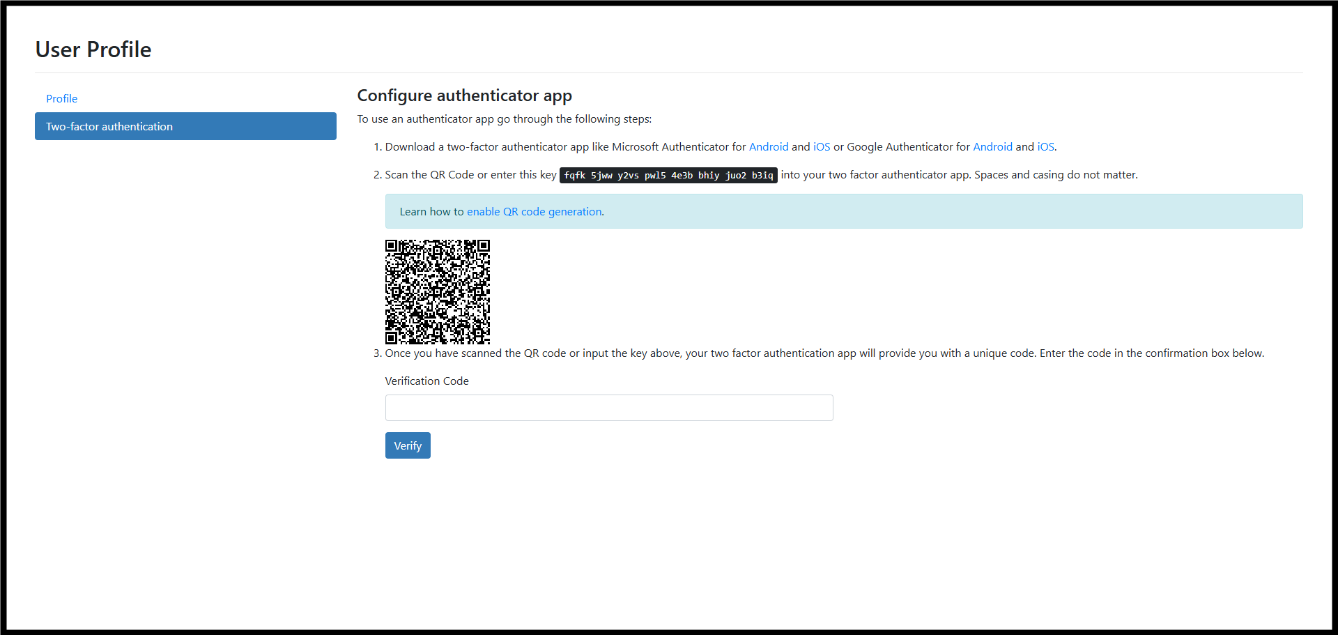 - The system will display instructions to configure the authenticator app.