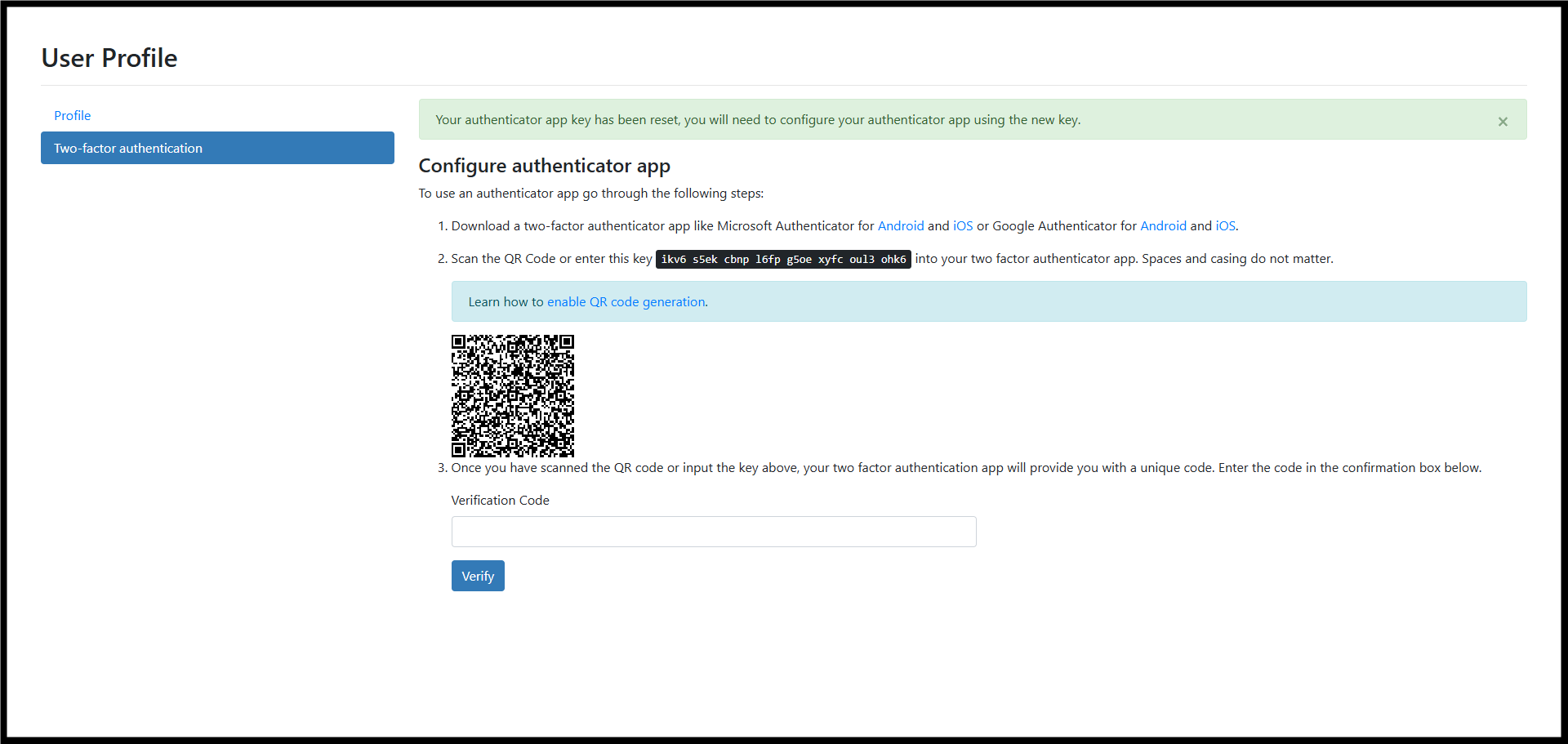 4. Configure your authenticator app again using the new key provided.