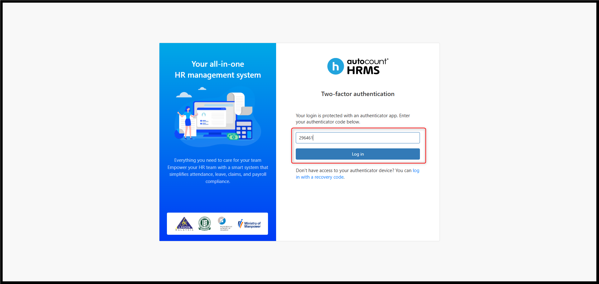 When Two-Factor Authentication is enabled, the system prompts an additional verification window after the user clicks Log in on the login page.