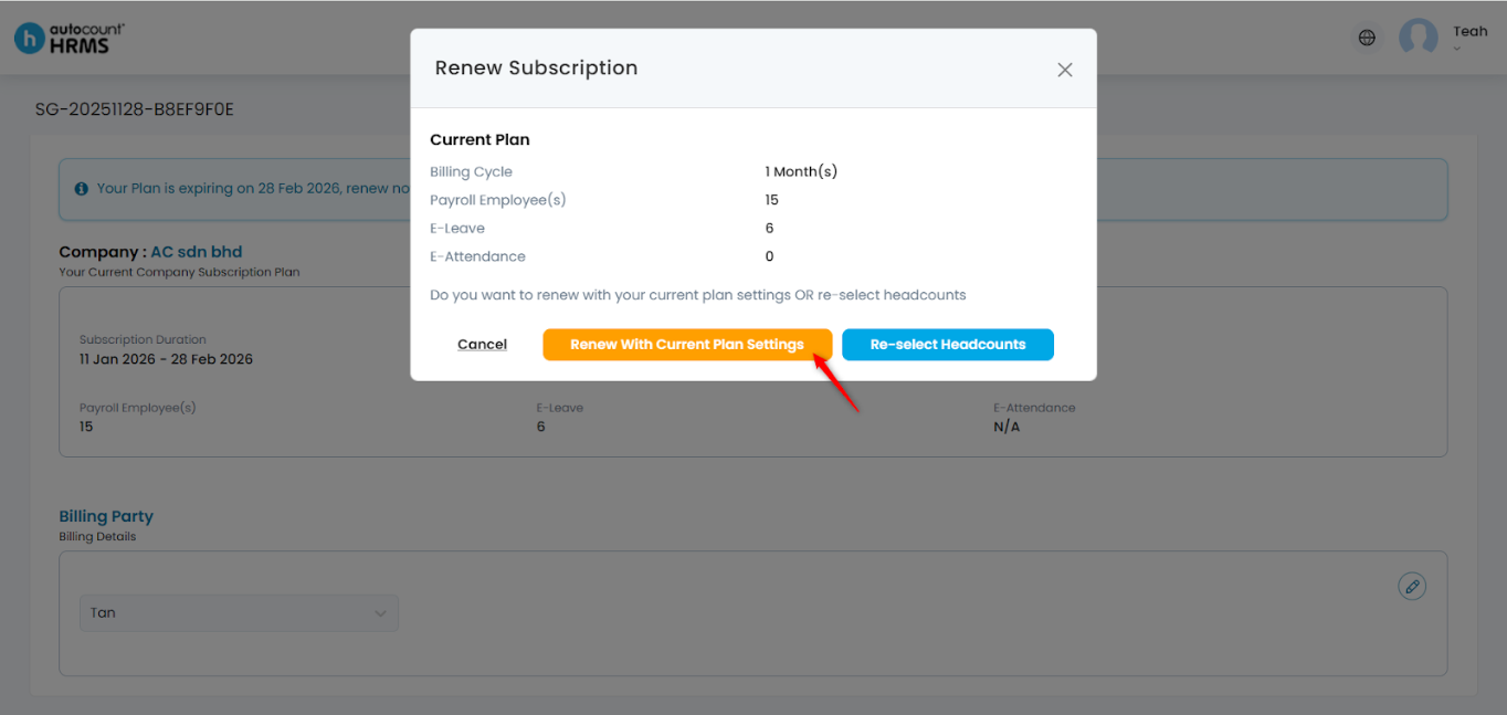- Option 1: Renew with Current Plan Settings– Renew subscription using the existing plan, headcount, and billing cycle.