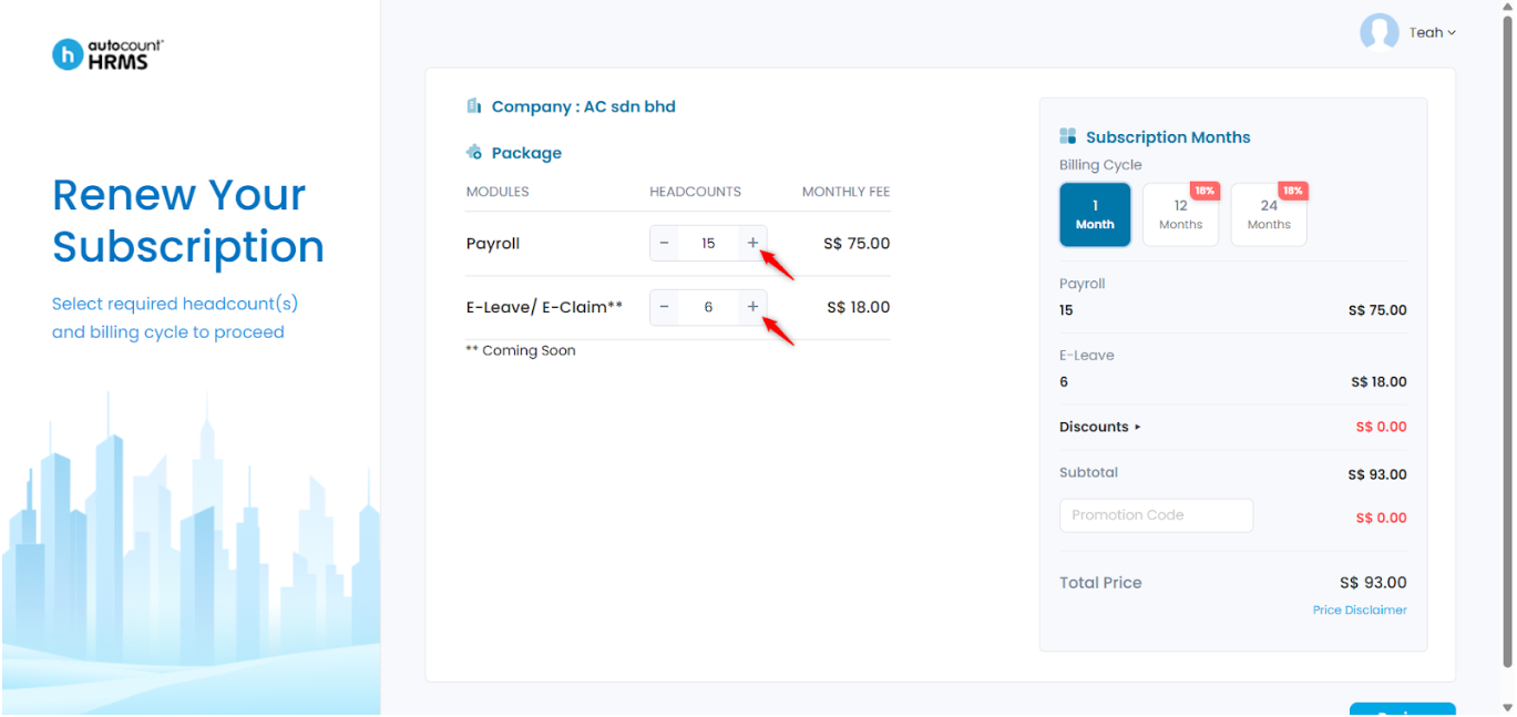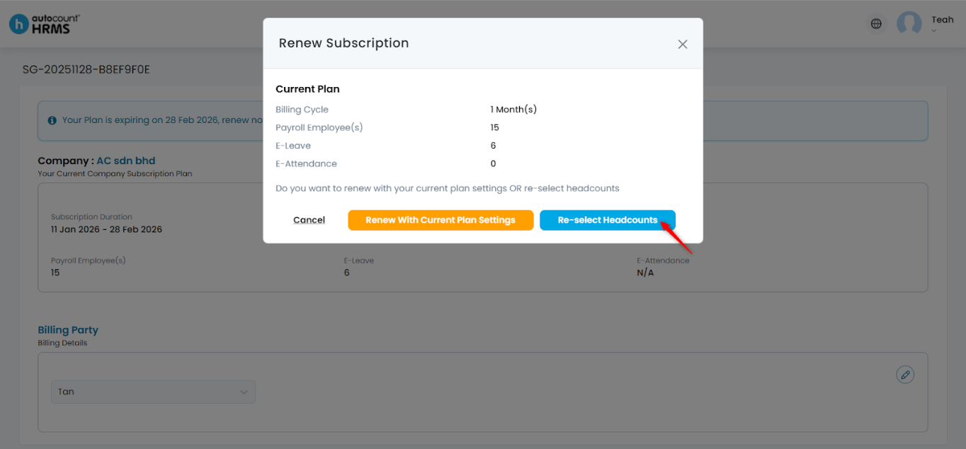 - Option 2: Re-select Headcounts – Edit your headcount and billing cycle before renewal.