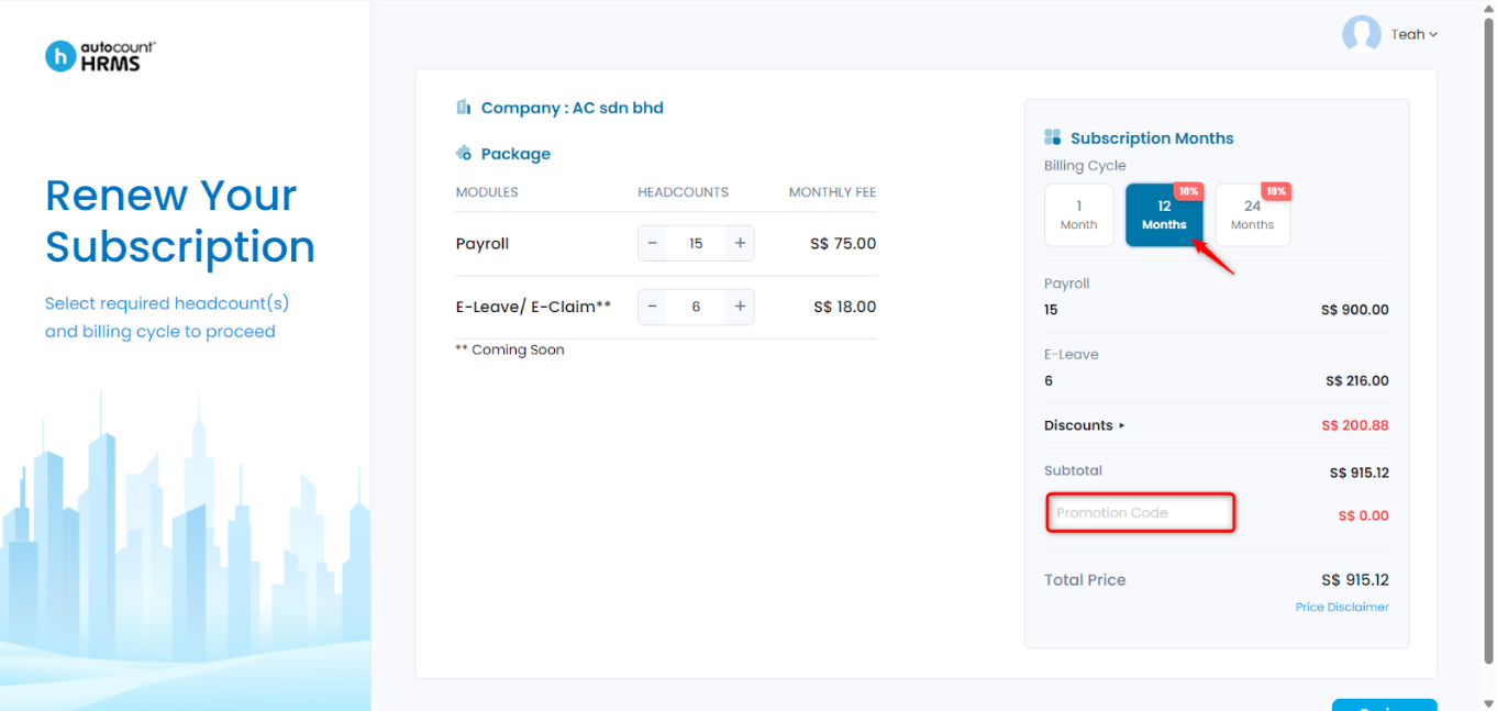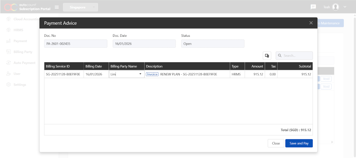 To continue using AutoCount HRMS without interruption, you must renew your subscription before it expires. Subscriptions can be renewed monthly or yearly, depending on your selected billing cycle.