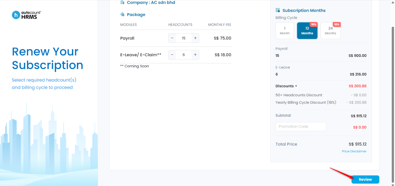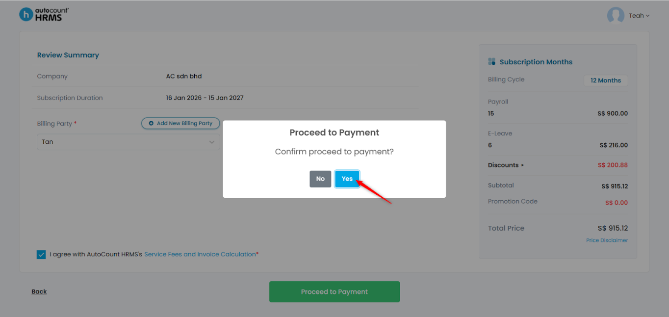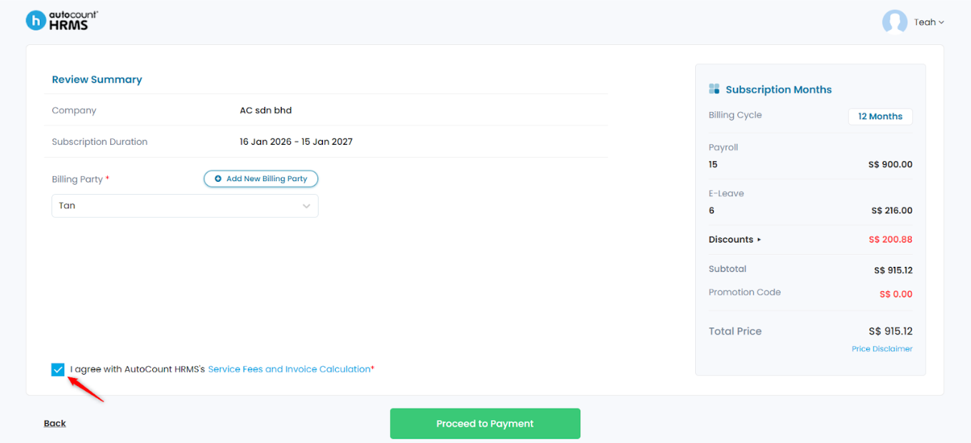 vi. Review the subscription summary and tick I agree with AutoCount HRMS Service Fees and Invoice Calculation.