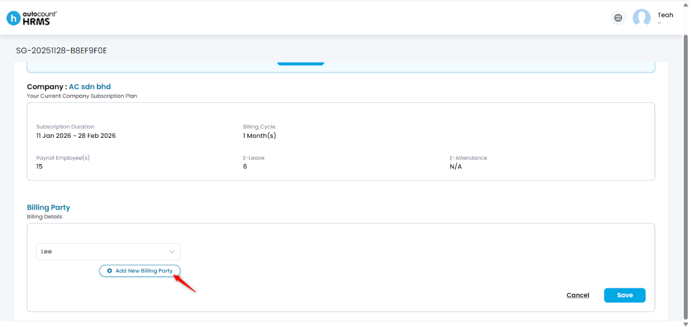 • Tax Registration Number (UEN) – Enter the billing party’s UEN number.