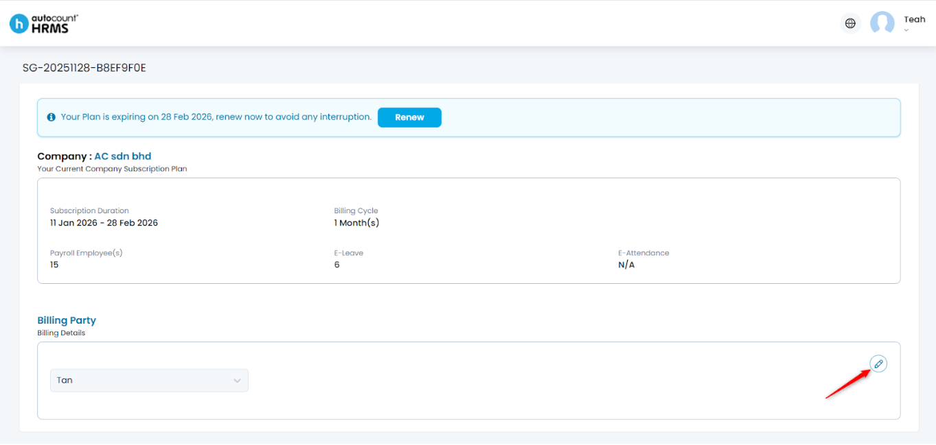 - Tax Registration Number (UEN) – Enter the billing party’s UEN number.