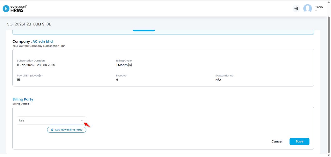 7. Select the billing party from the drop-down list.