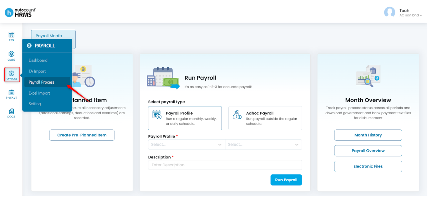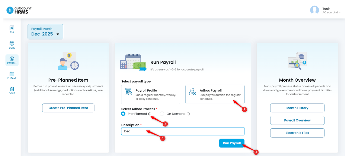 4. Under Run Payroll, select Adhoc Payroll, choose Pre-Planned, enter the Description, then click Run Payroll.