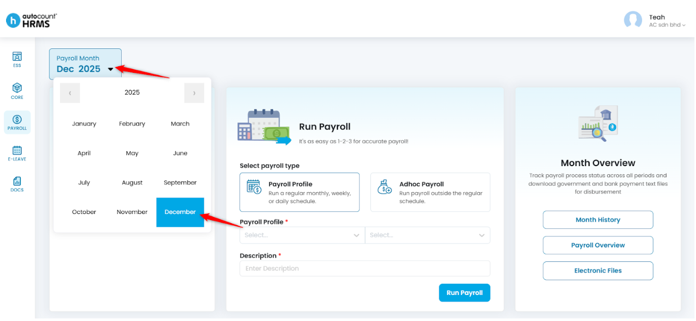 2. Click on the Payroll Month and choose the month and year of payroll you want to process.