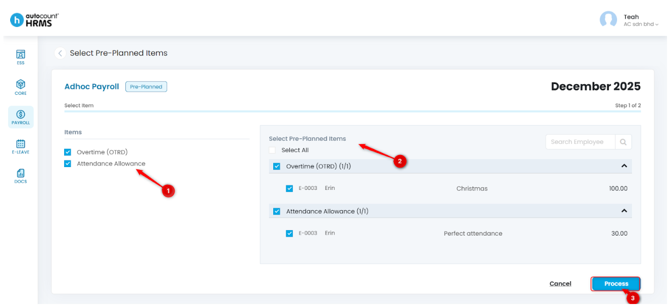 5. Select the Pre-Planned items and respective employees to include in this payroll run, then click Process.