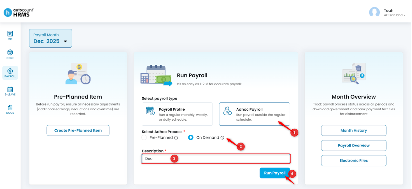 1. Under Run Payroll, select Adhoc Payroll, choose On Demand, enter the Description, and click Run Payroll to proceed.
