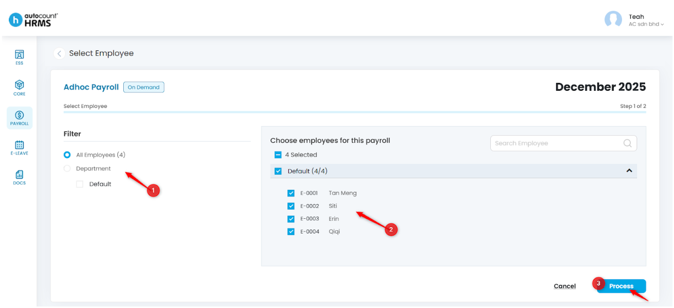 3. Select the employees to include in this payroll run, then click Process.