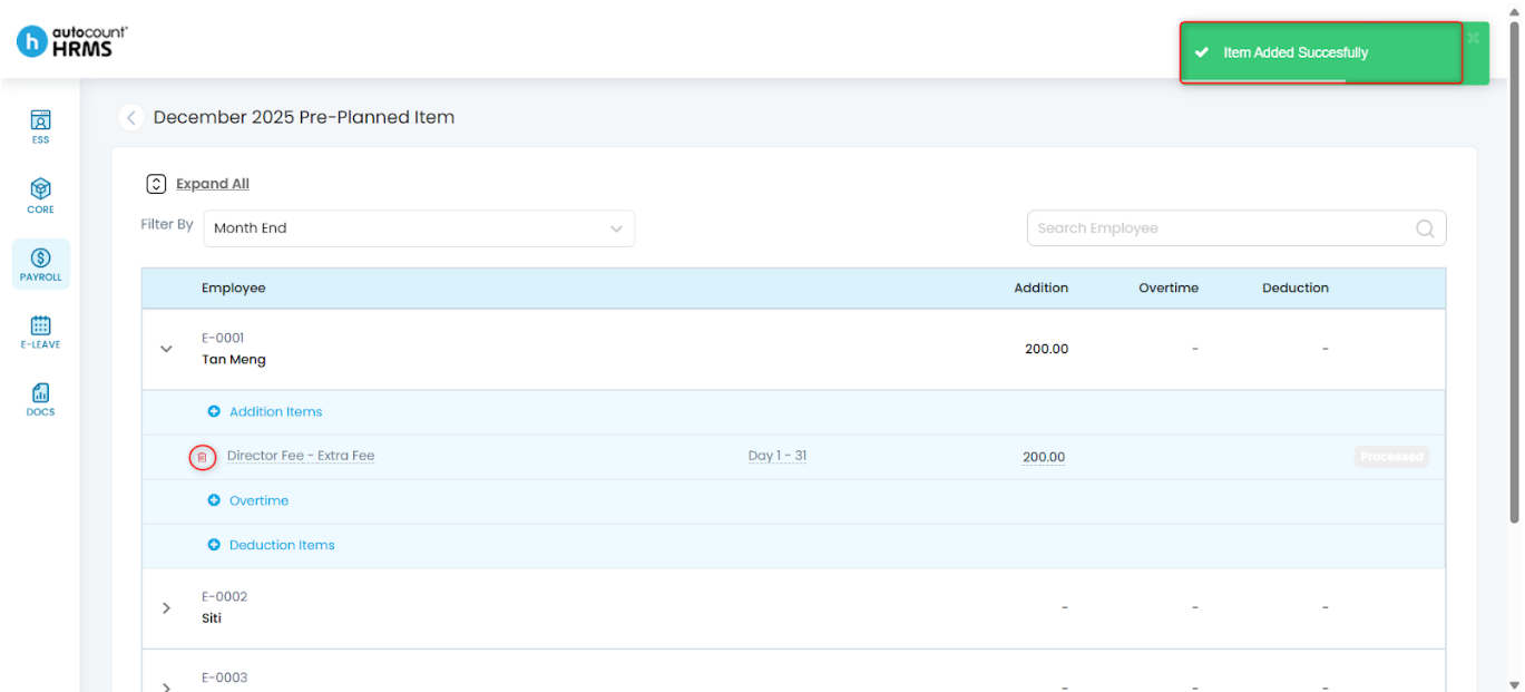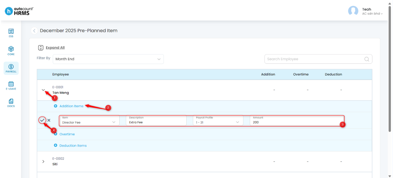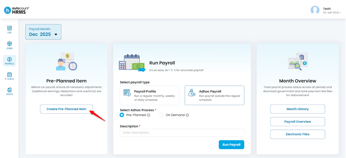 - For Adhoc Payroll Pre-Planned, pre-planned Addition and Overtime items must be created before running payroll.