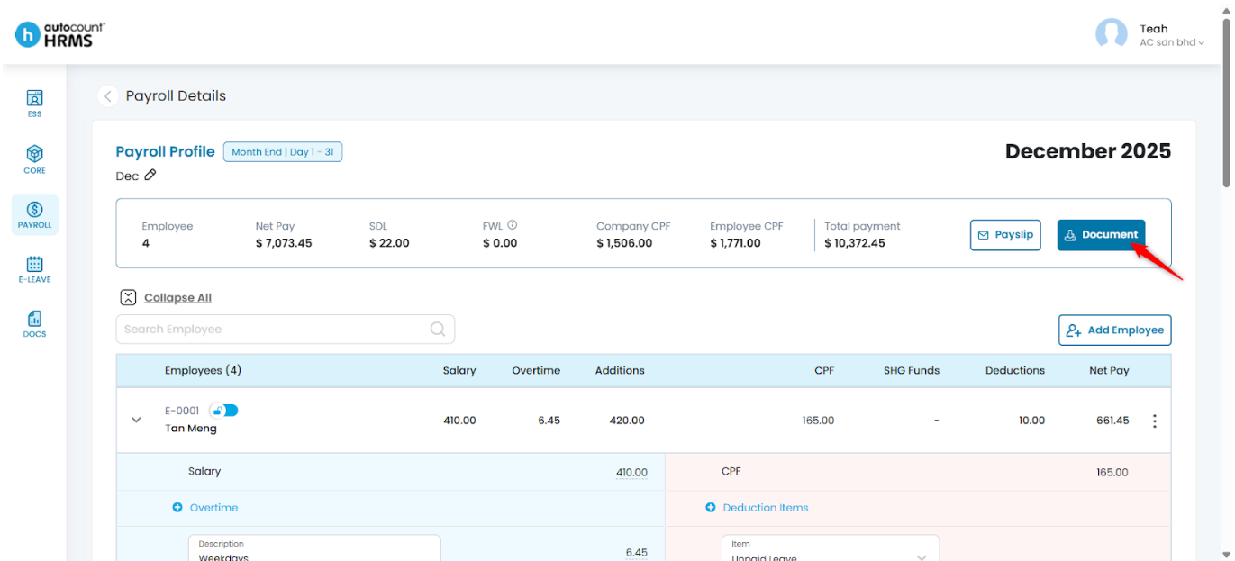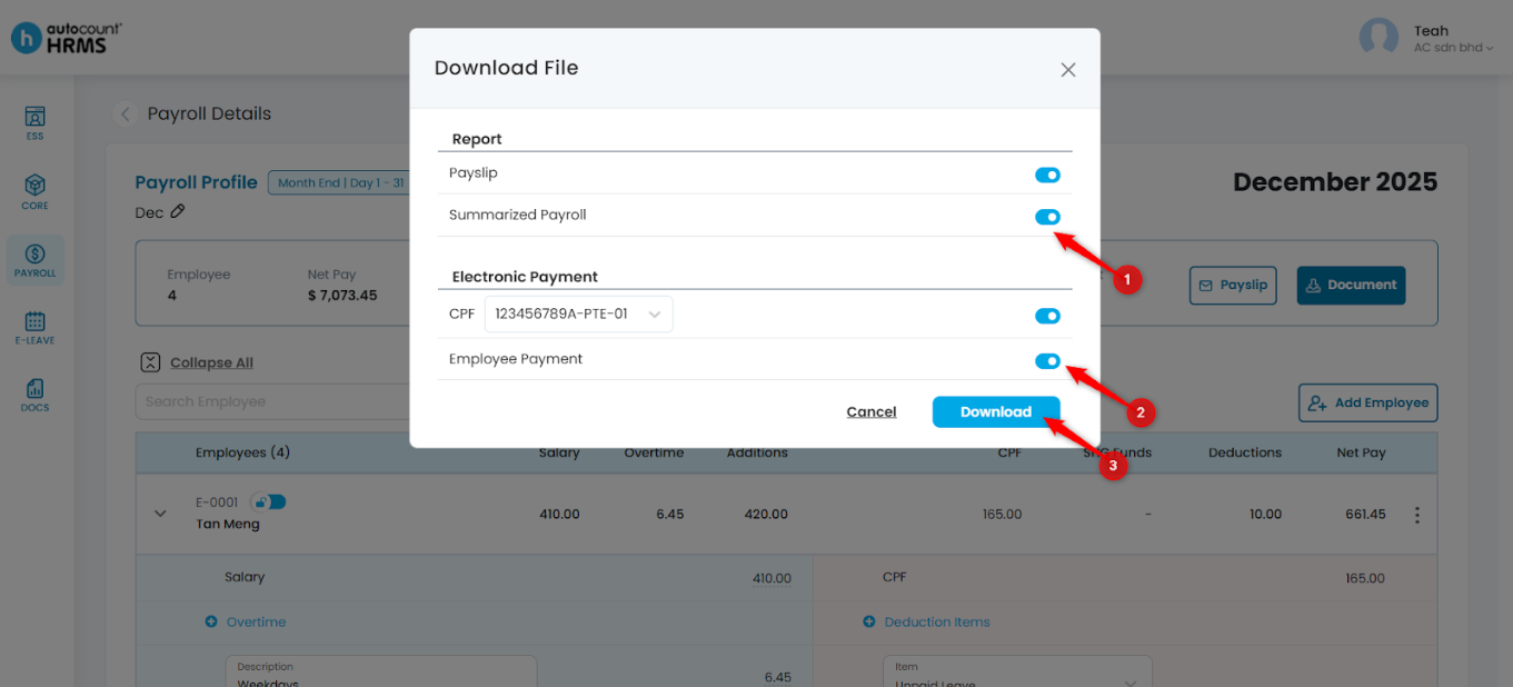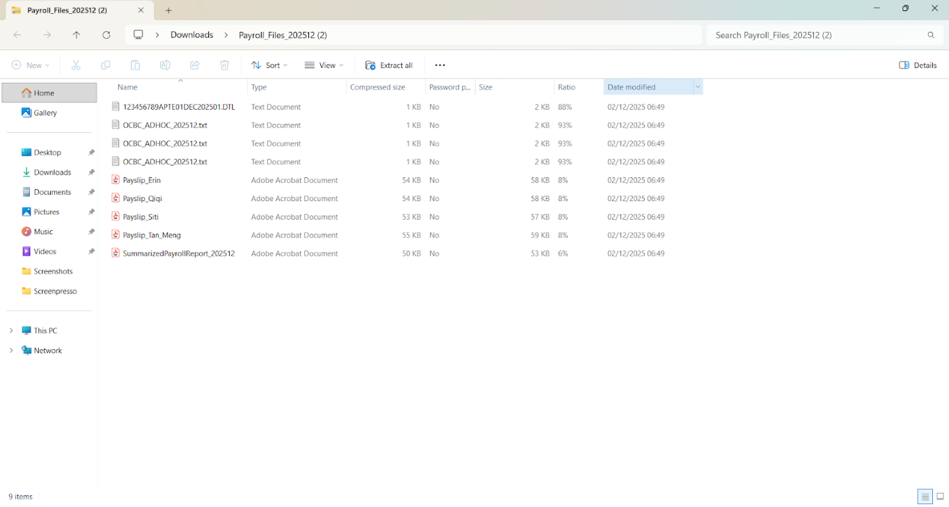 After completing a payroll run, you may download various payroll documents such as Payslips, Summary Reports, and Electronic Payment Text Files for bank submission.