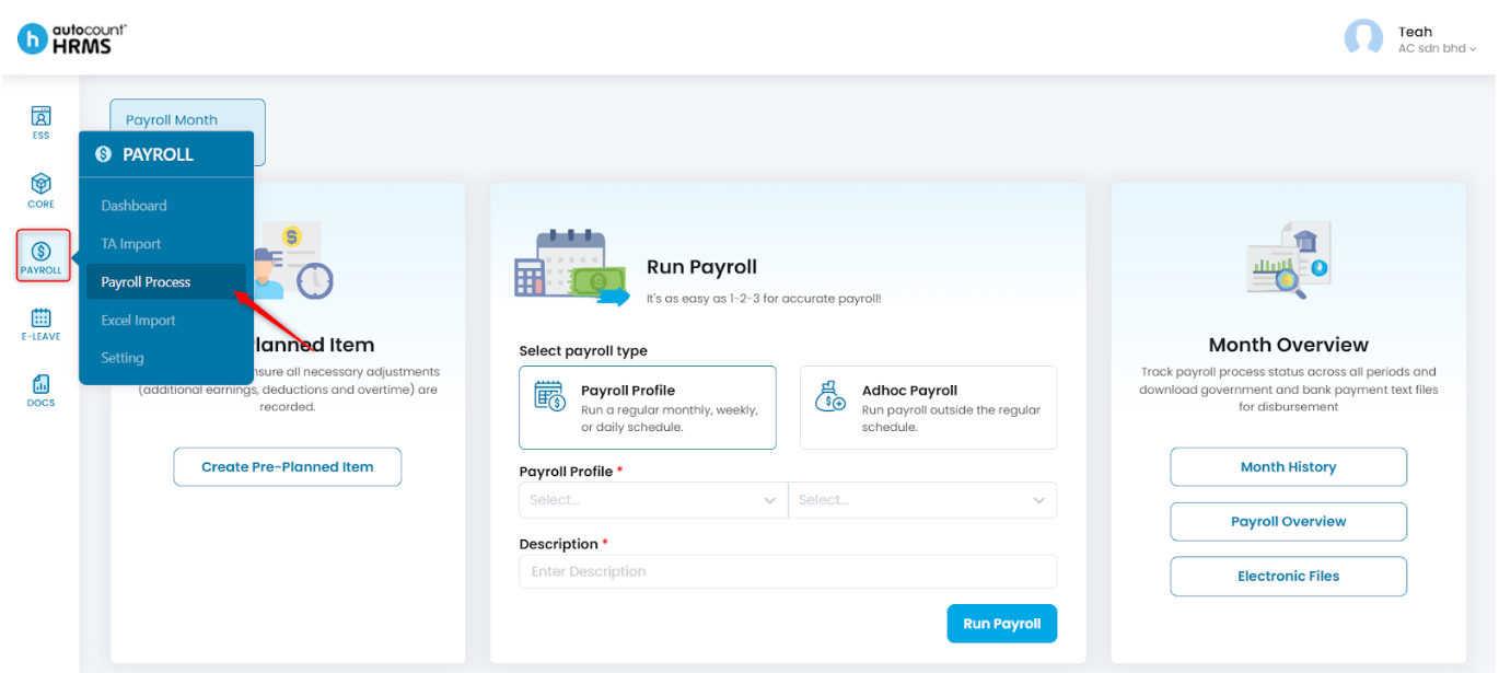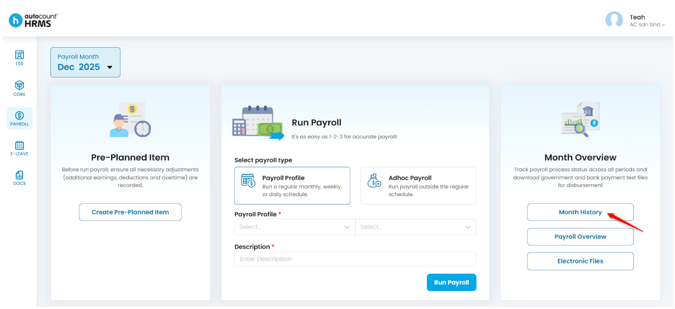 - Month History – View all payroll processes completed for the selected month.