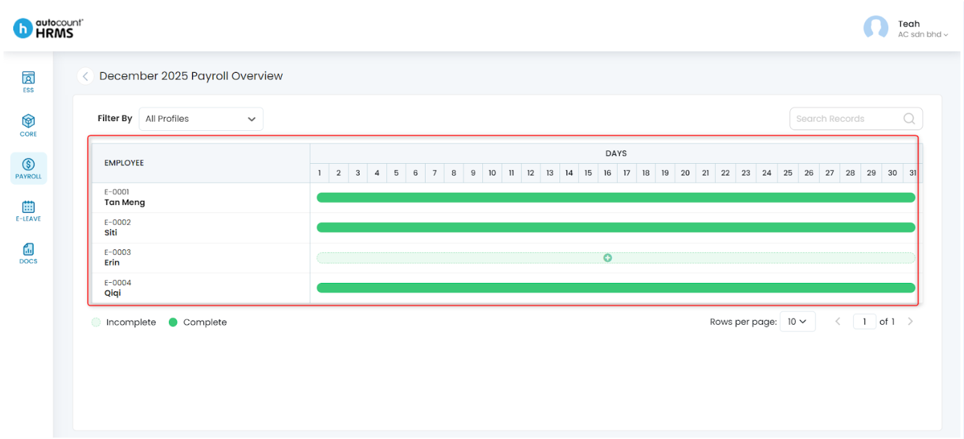 - Payroll Overview – Review individual employee payroll progress and identify incomplete records.