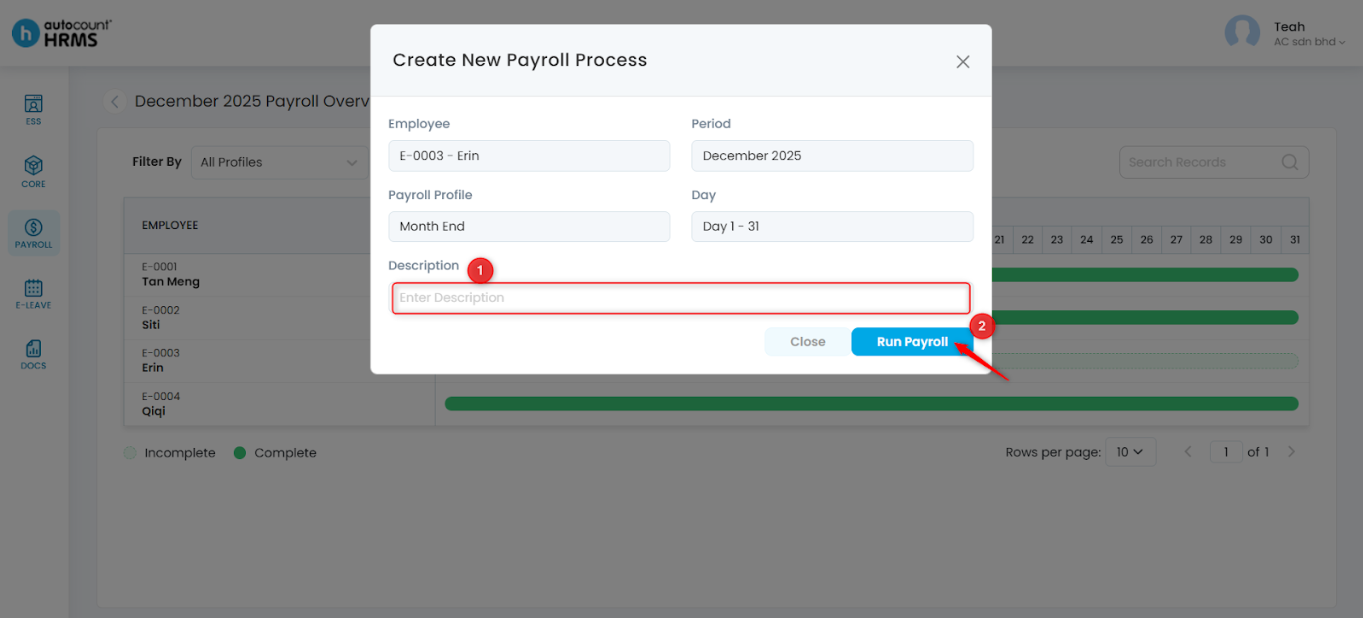 4. A Create New Payroll Process panel will appear. Verify the employee details and date period, enter a Description, and click Run Payroll.