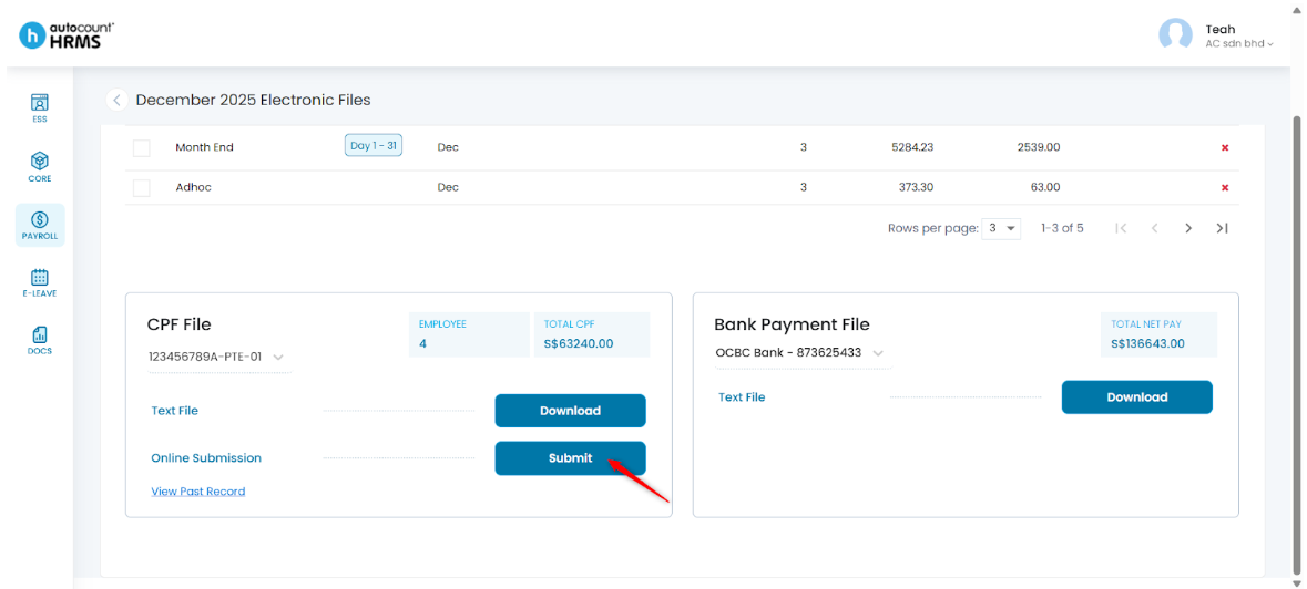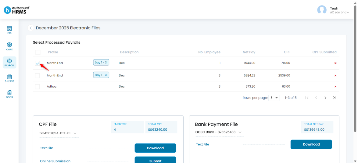 5. To submit CPF files, tick the processed payrolls you want to submit.