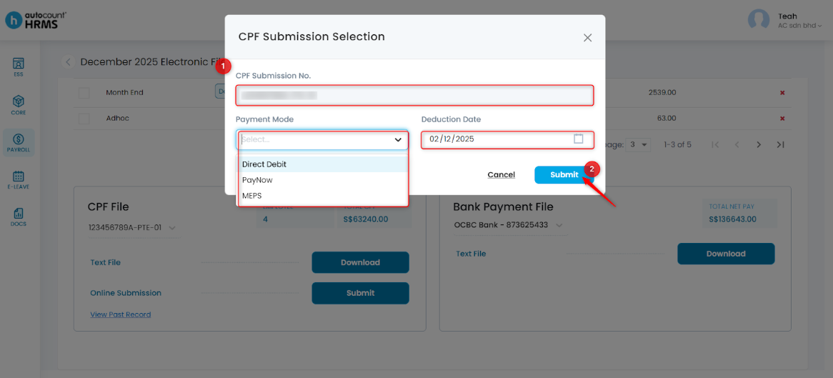 7. In the CPF Submission Selection panel, confirm your CPF Submission No., select the Payment Mode, and choose the Deduction Date. Then, click Submit.