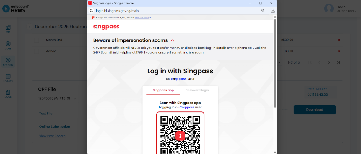 8. A login window will appear — sign in using your Corppass (Singpass) account.