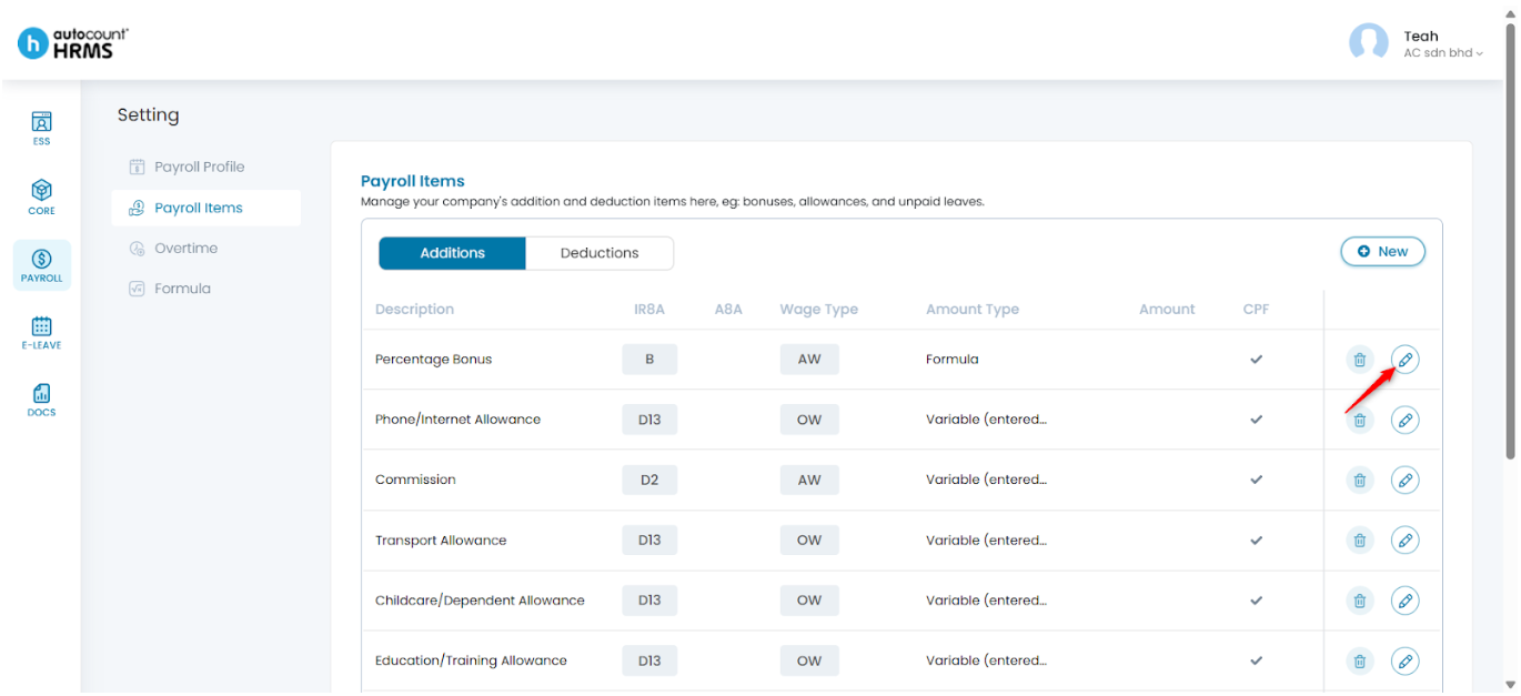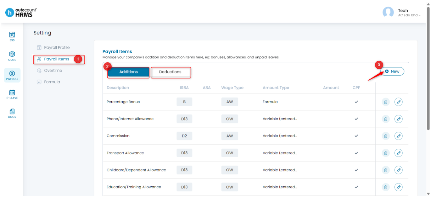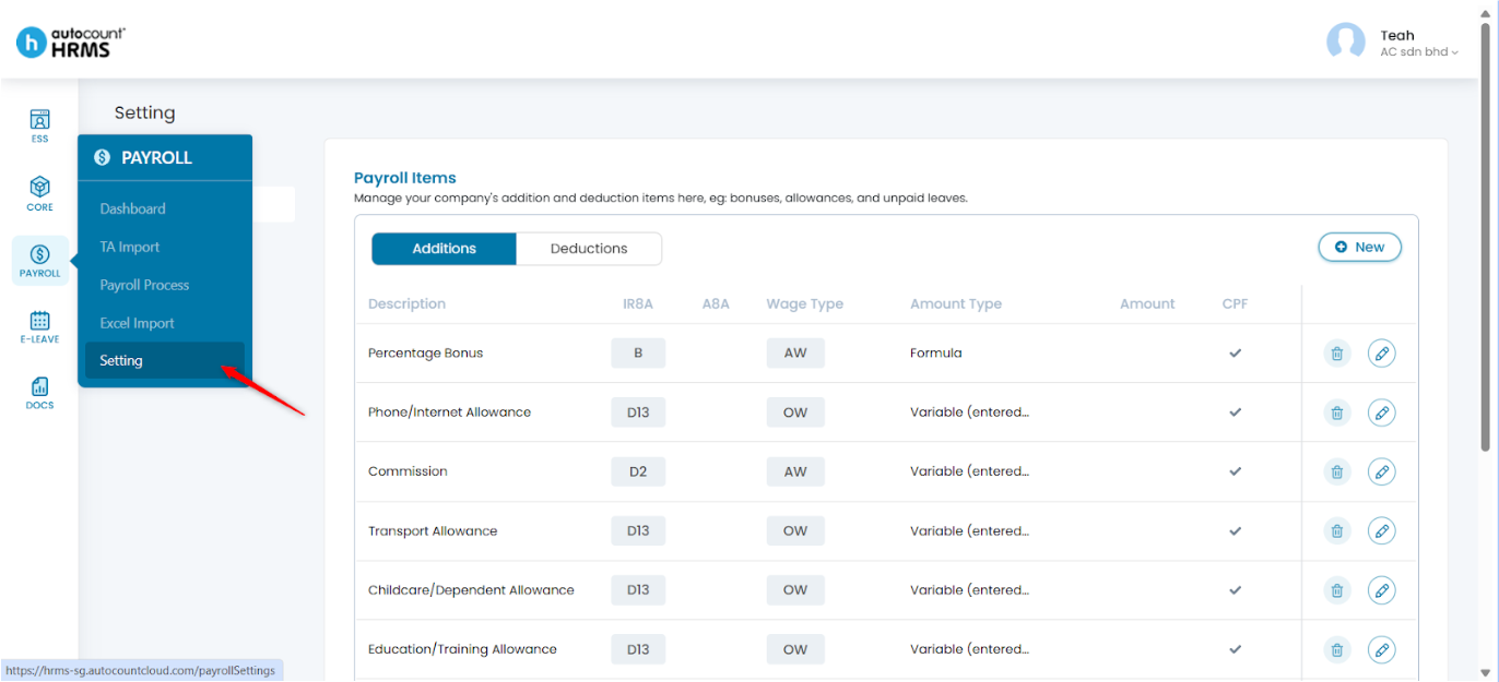 2. Under Setting, select Payroll Items. Choose the category you want to add (Additions or Deductions) and click New at the top right corner.