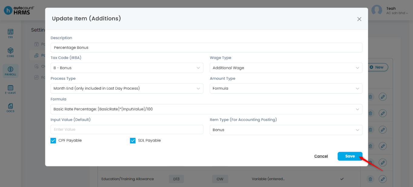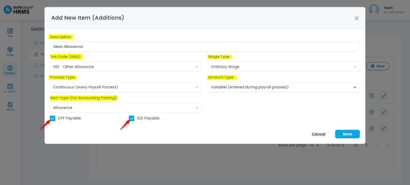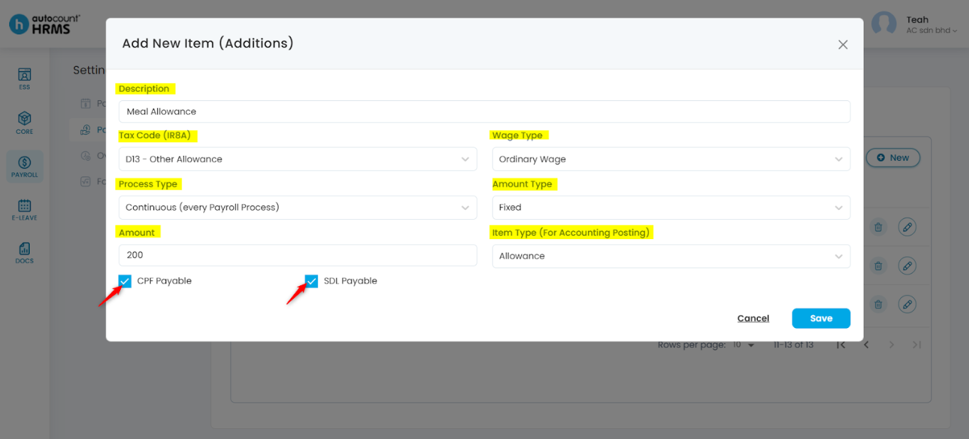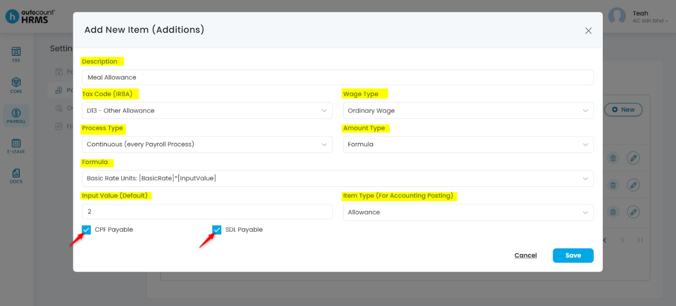 • CPF Payable – Tick if the item is subject to CPF.