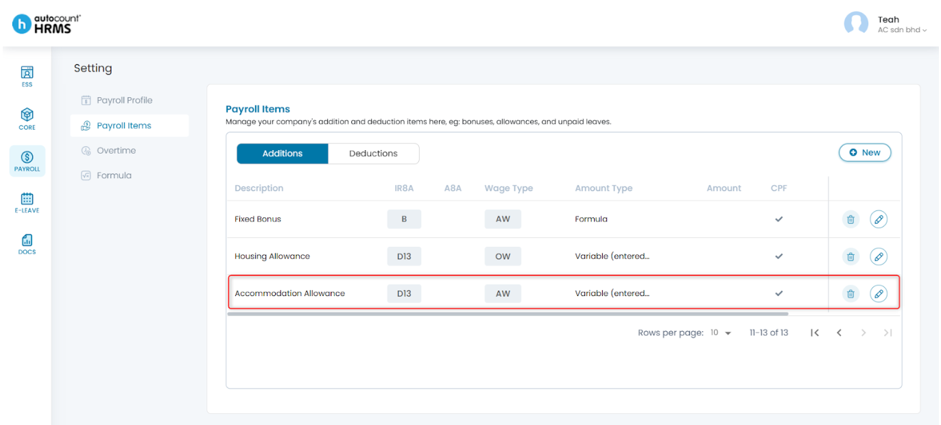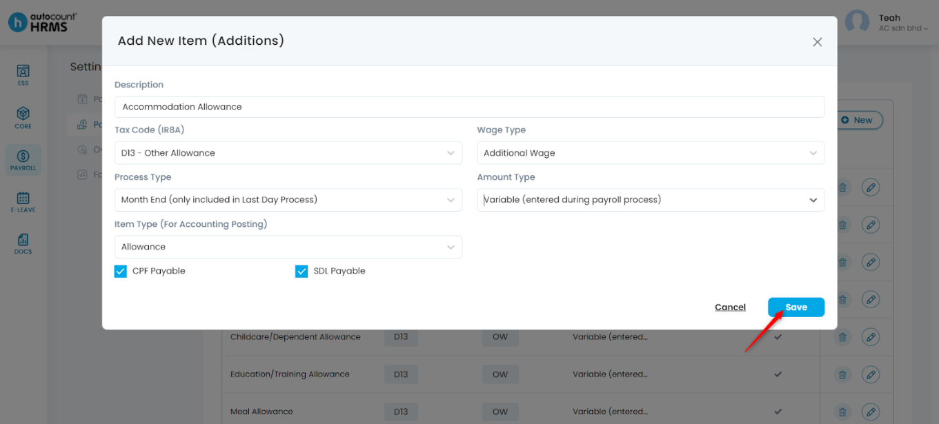 5. Once saved, the payroll item will appear in the list and can be used during payroll processing.