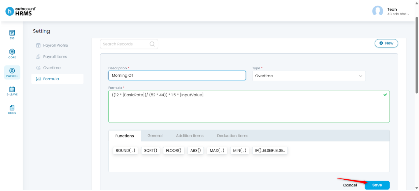 The HRMS Formula feature allows employers to view, create, and manage formulas used to calculate payroll items such as Additions, Deductions, and Overtime. These formulas help automate payroll processing by ensuring consistent and accurate calculations for all applicable payroll items.