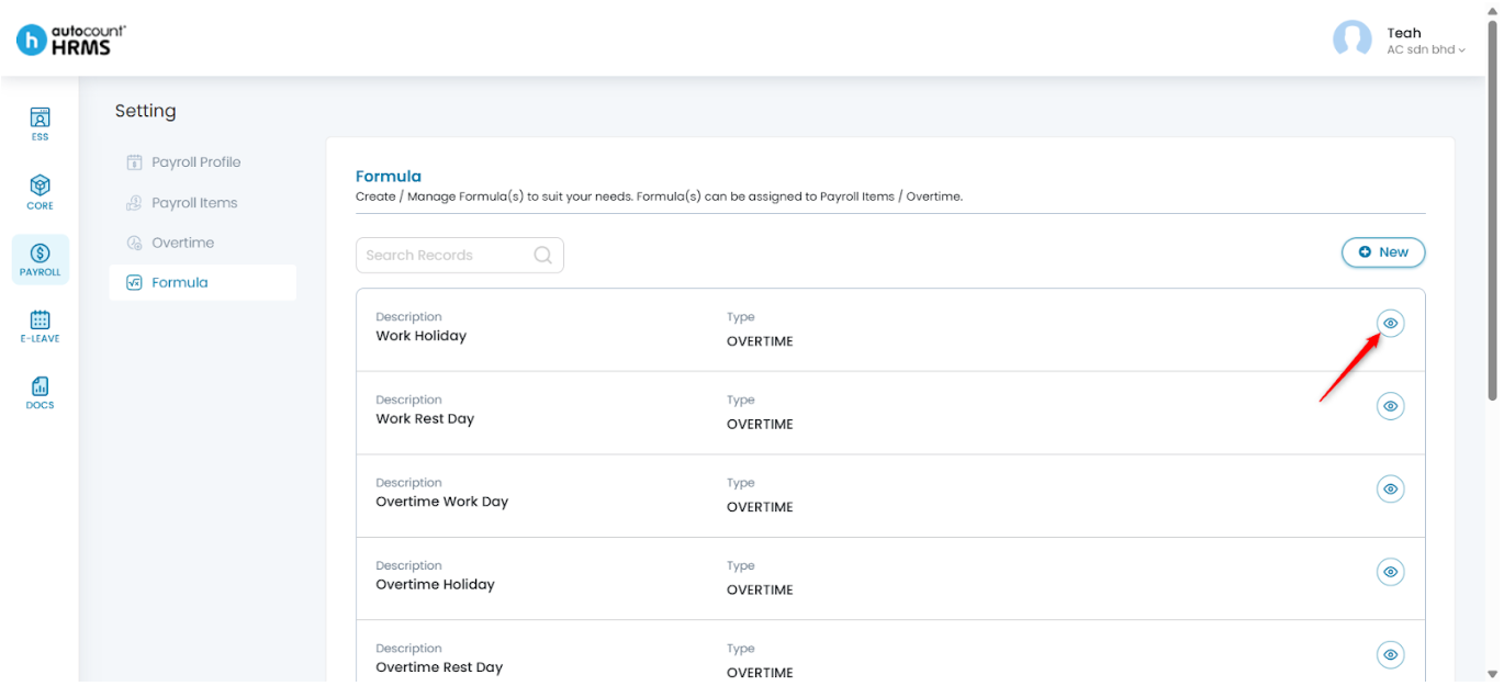 - Overtime Formula – Used to calculate overtime payments. The default formulas follow Singapore’s Ministry of Manpower (MOM) requirements and can be previewed but not edited. However, employers may create new custom formulas if needed.