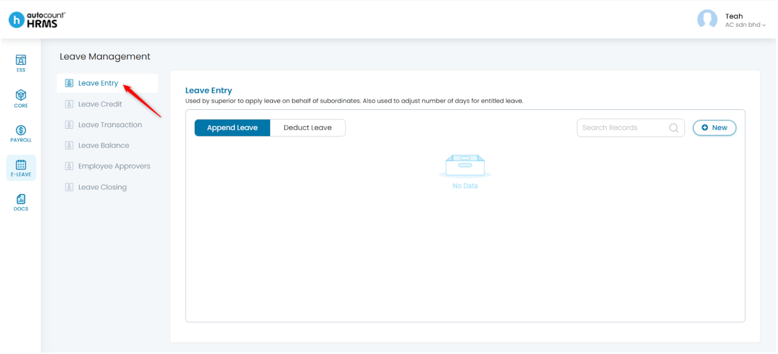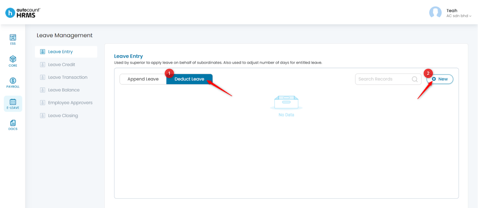 1. Under Leave Entry, select Deduct Leave, then click New.