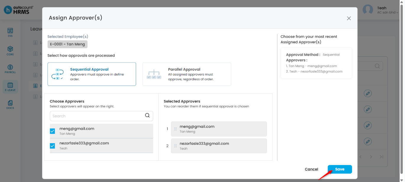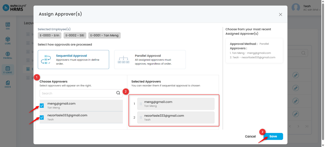 2. Tick the approvers you want to include. Arrange the order of approvers in the Selected Approvers section. Then, click Save