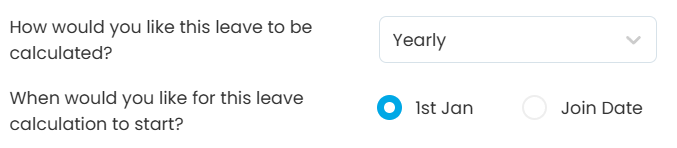 - Yearly – The full leave entitlement for the calendar year is provided upfront.