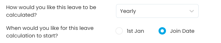 - 1st of Jan – The leave entitlement is calculated based on the full calendar year, regardless of the employee’s join date.