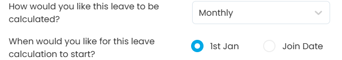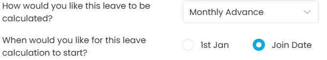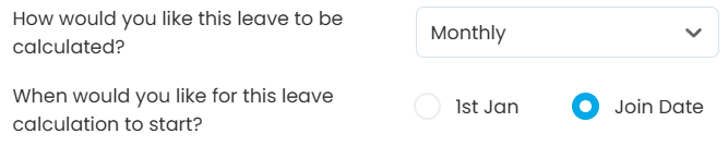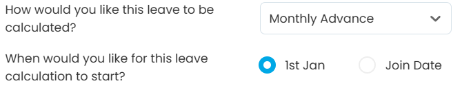5 | Monthly Advanced | 1st Jan | 12 days | July: 2 days Aug: 4 days Sept: 6 days Oct: 8 days Nov: 10 days Dec: 12 days | Leave is calculated from 1st of Jan, regardless of the employee’s join date and given based on the monthly allocation at the start of each month. Employee B will receive 2 days of leave at the start of each month. |