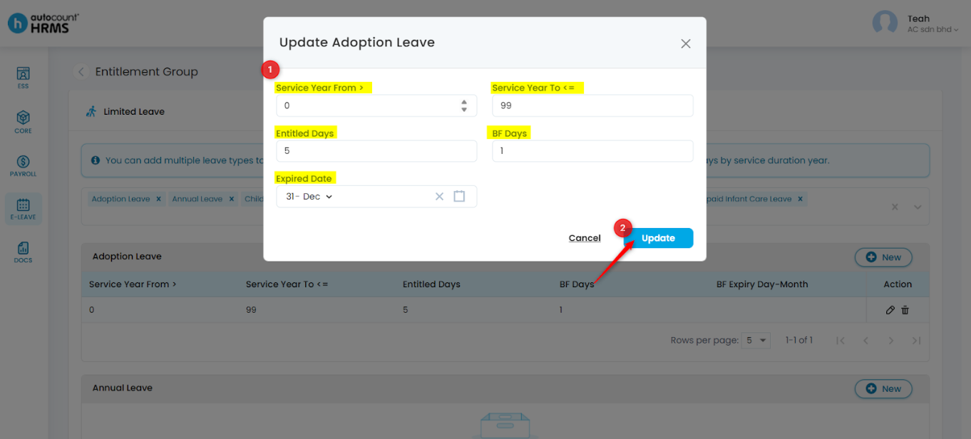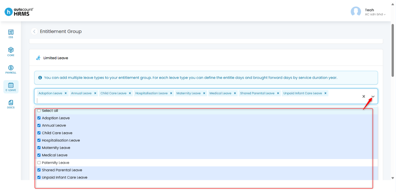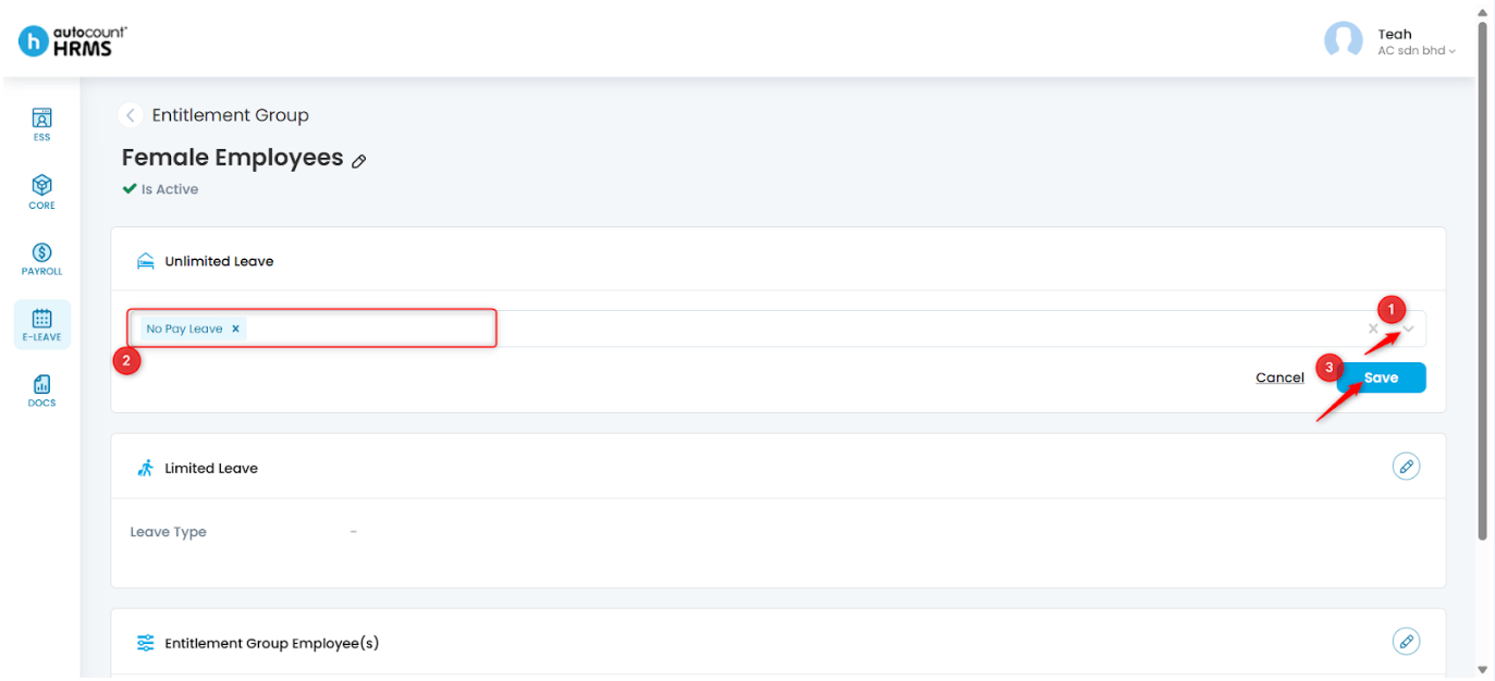 Note: To add or remove Leave Types within the Limited or Unlimited categories, go to E-Leave > Setting > Leave Type. (See Leave Type)