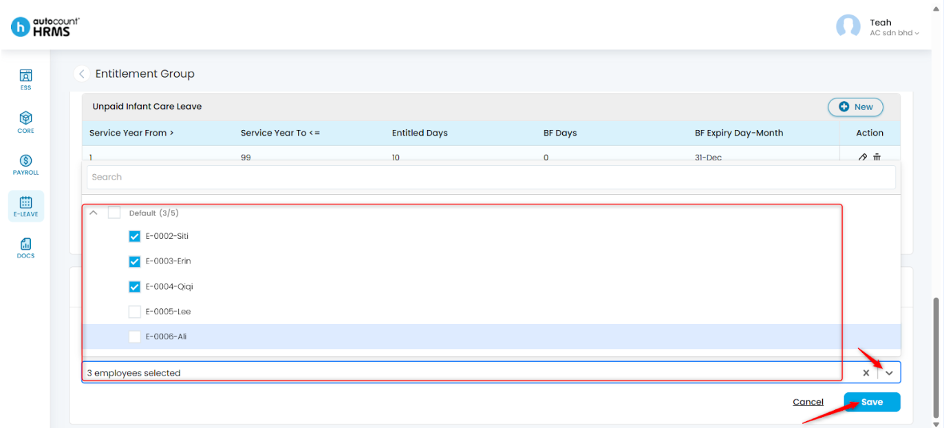 ii. Select Leave Type(s) from the dropdown list (e.g., No Pay Leave). Then, click Save.