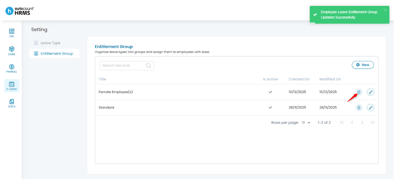 4. Return to the Entitlement Group page and click the trash bin icon.