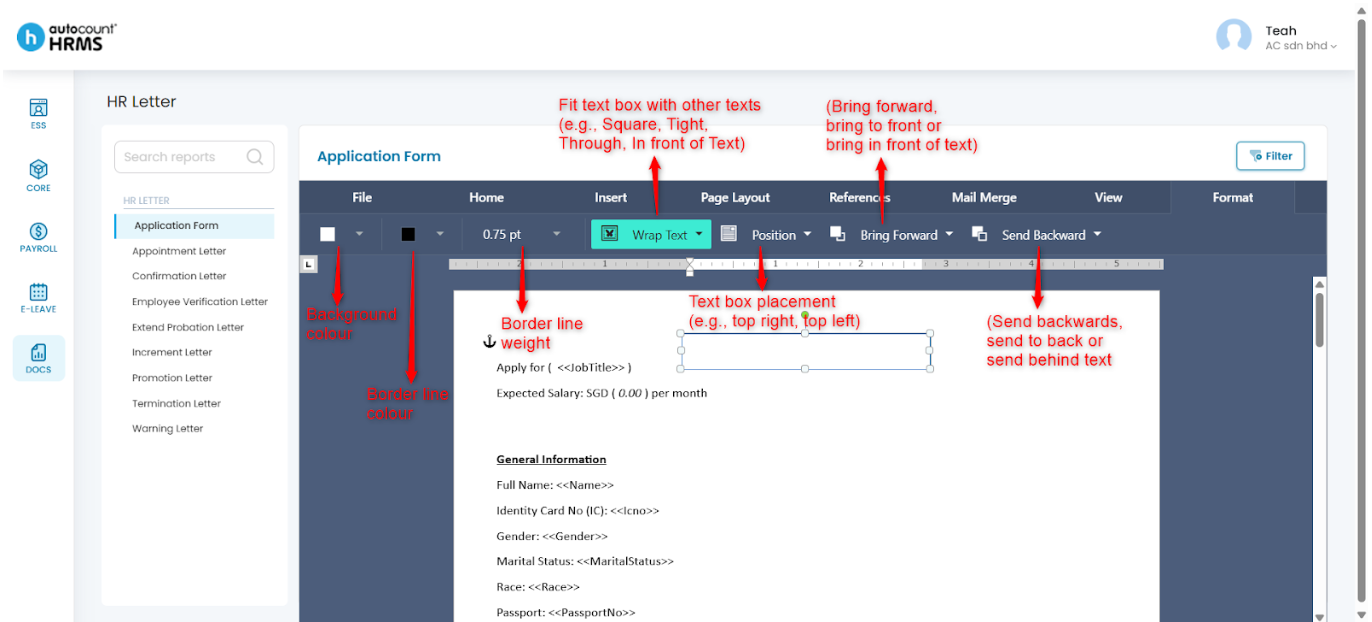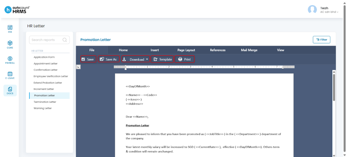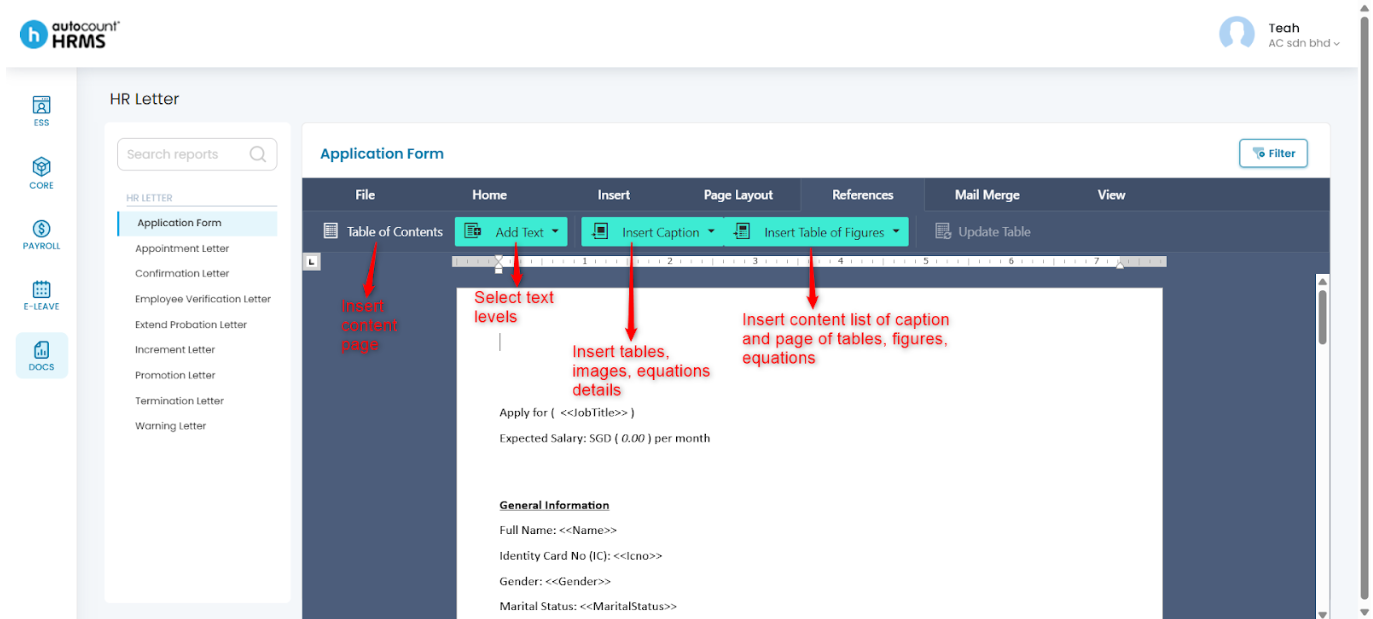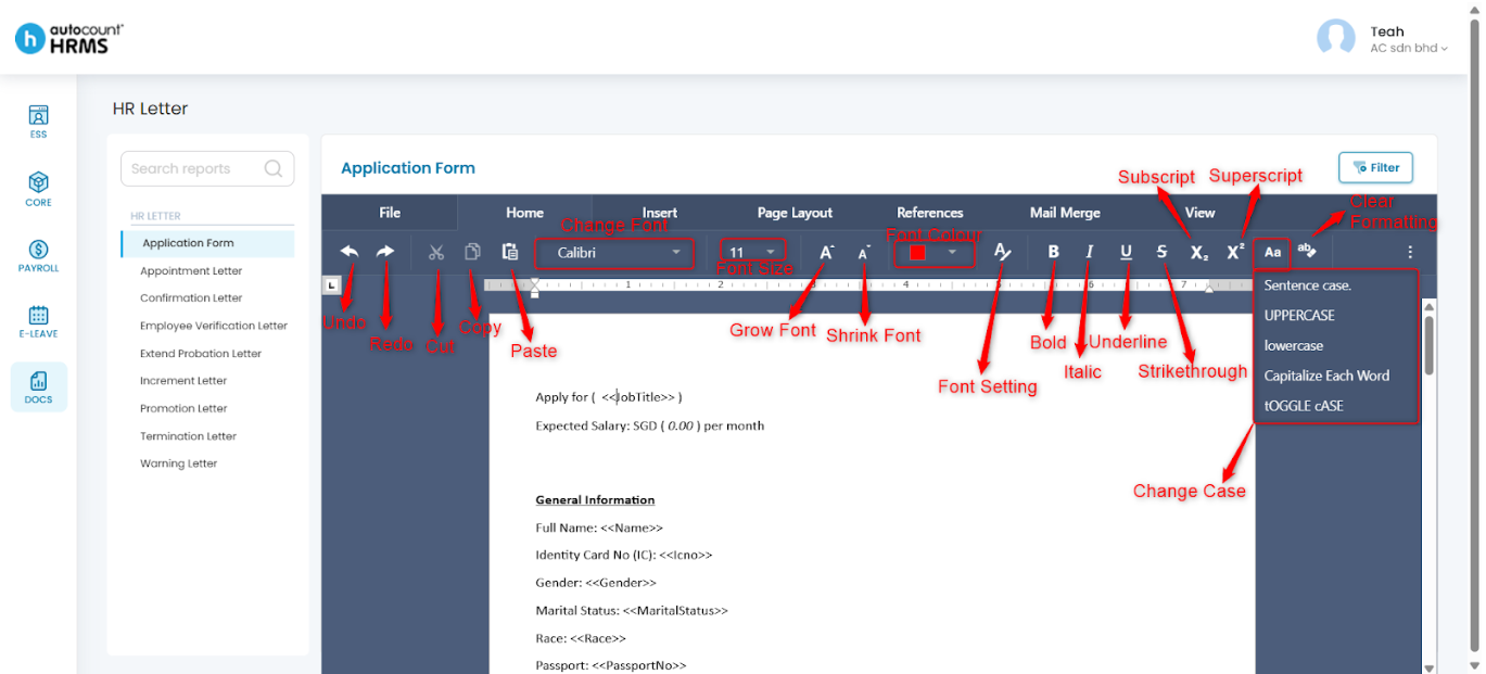 After selecting a HR letter template, employers can customise the letter using the toolbar options described below.