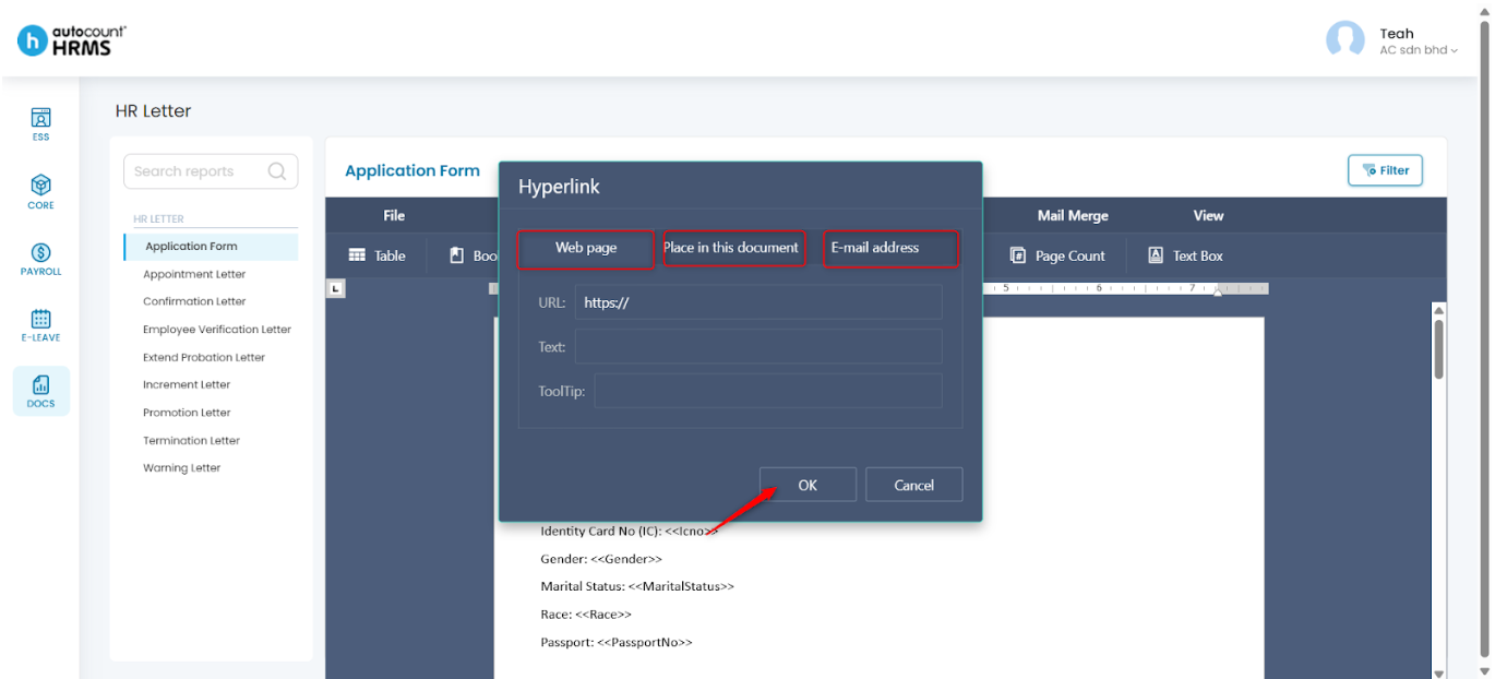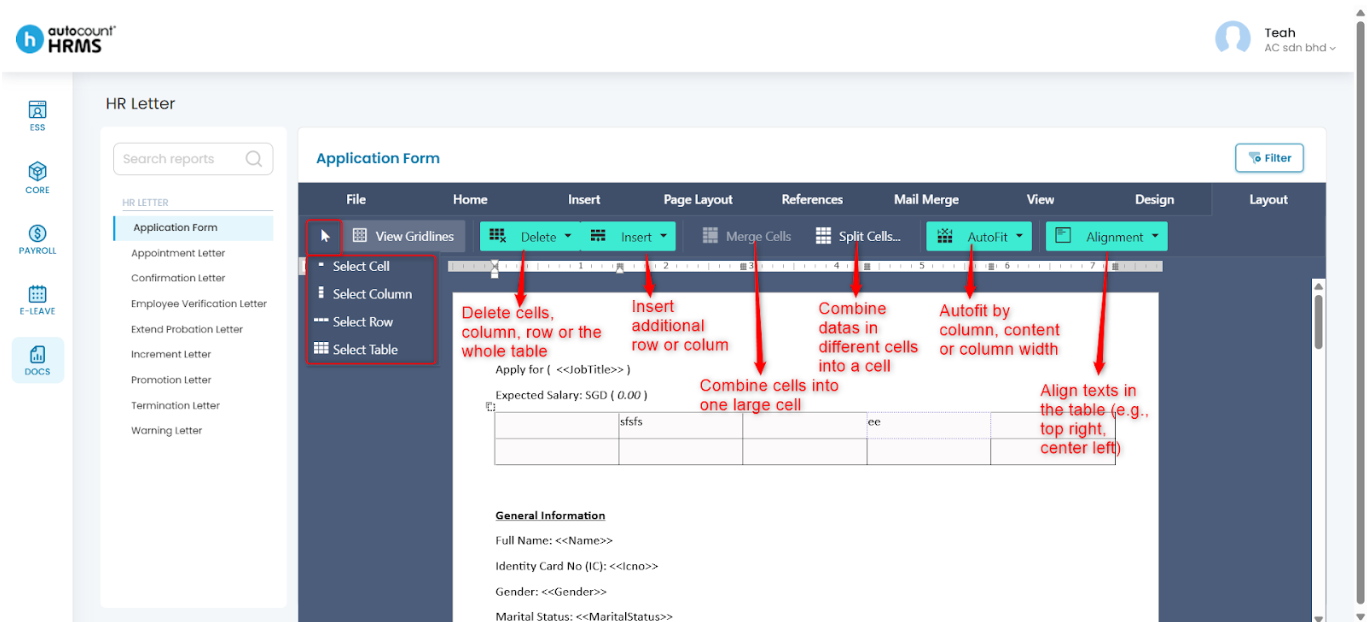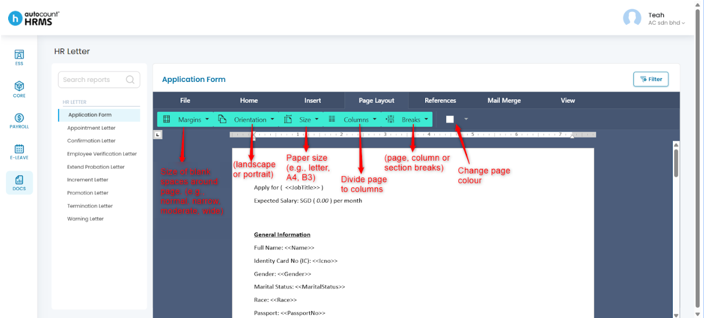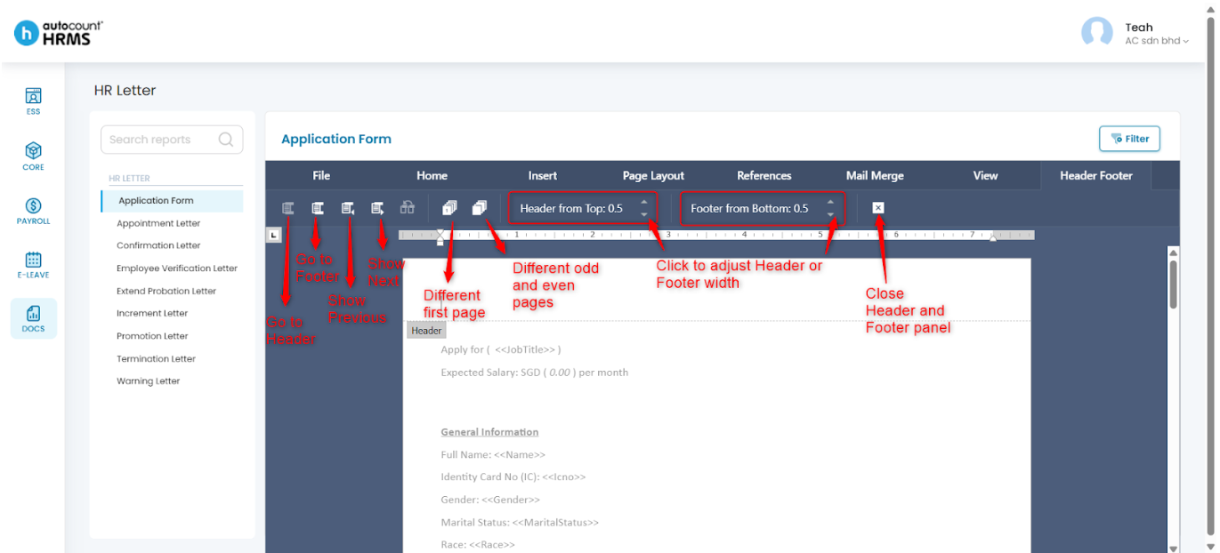 After selecting a HR letter template, employers can customise the letter using the toolbar options described below.