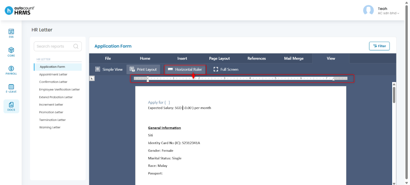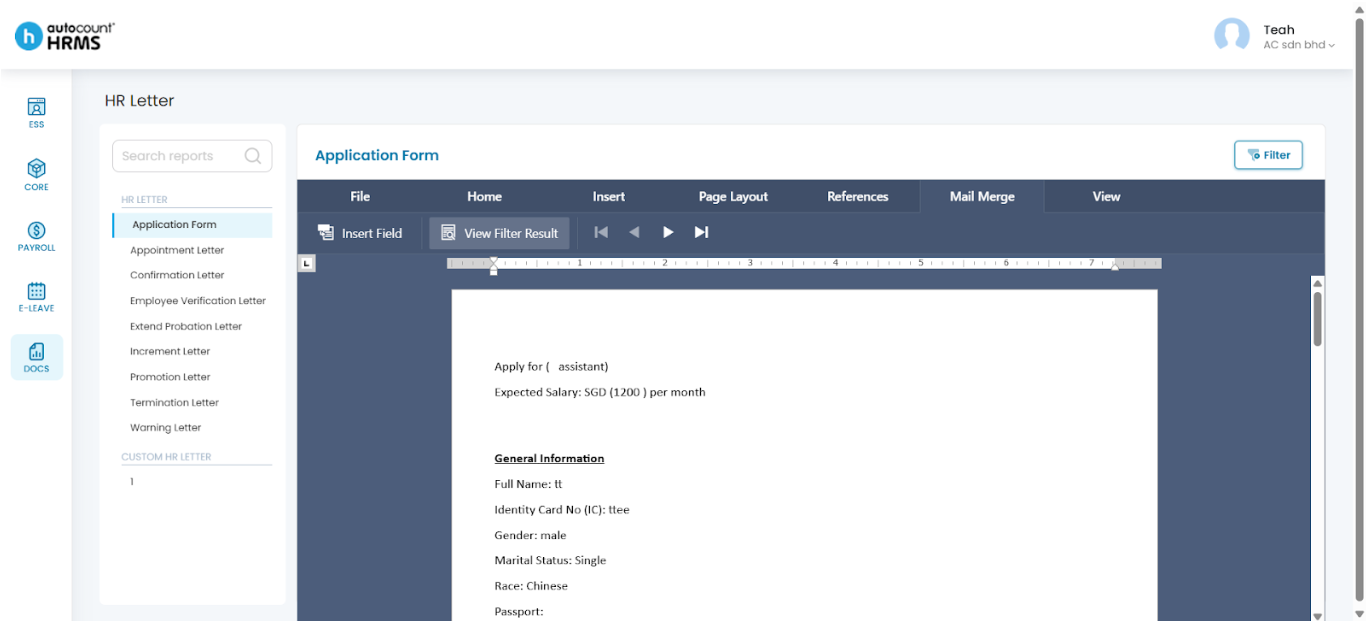 • View Filter Result – Apply employee data automatically. Refer to HR Letter.