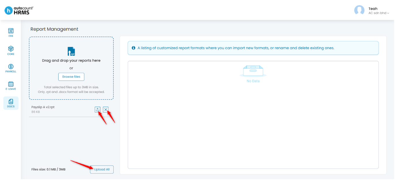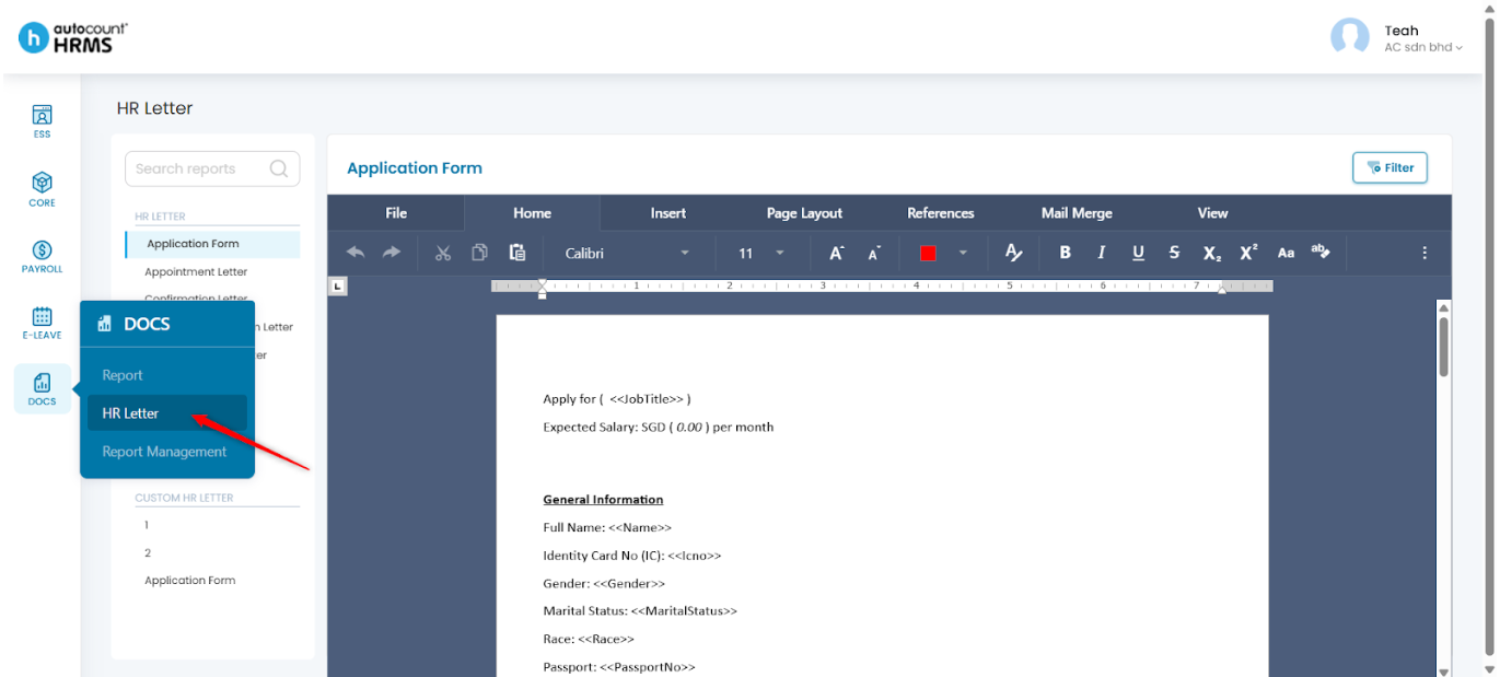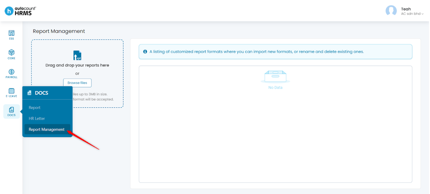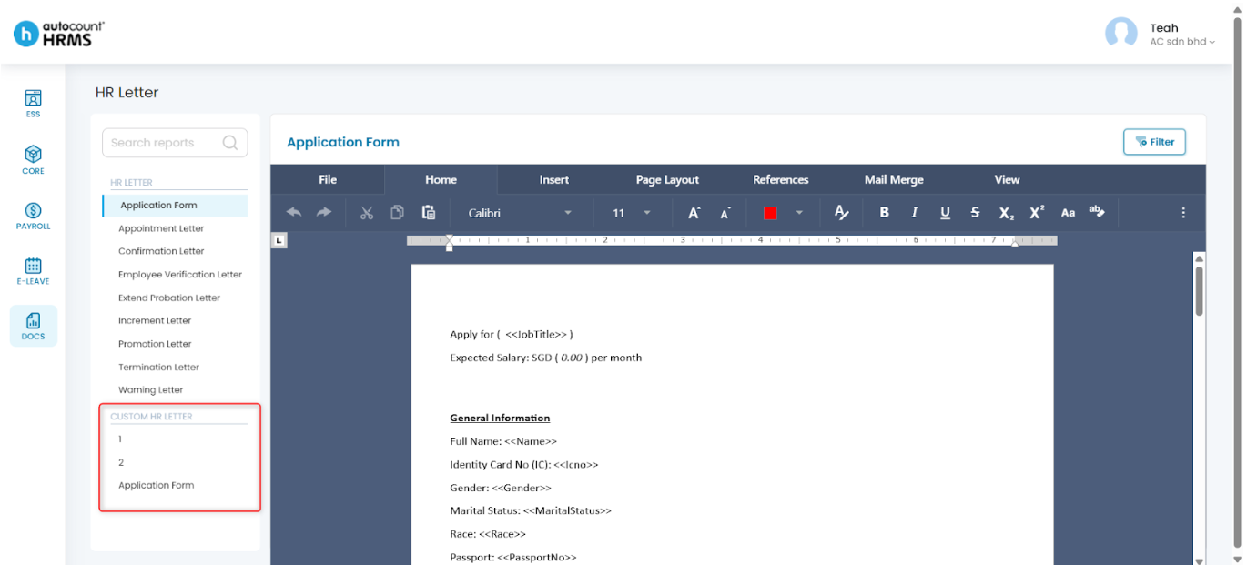 Report Management allows employers to upload customised report formats and HR letter templates based on company requirements. These formats can then be selected and used when generating reports under Docs > Report and HR Letter under Docs > HR Letter.