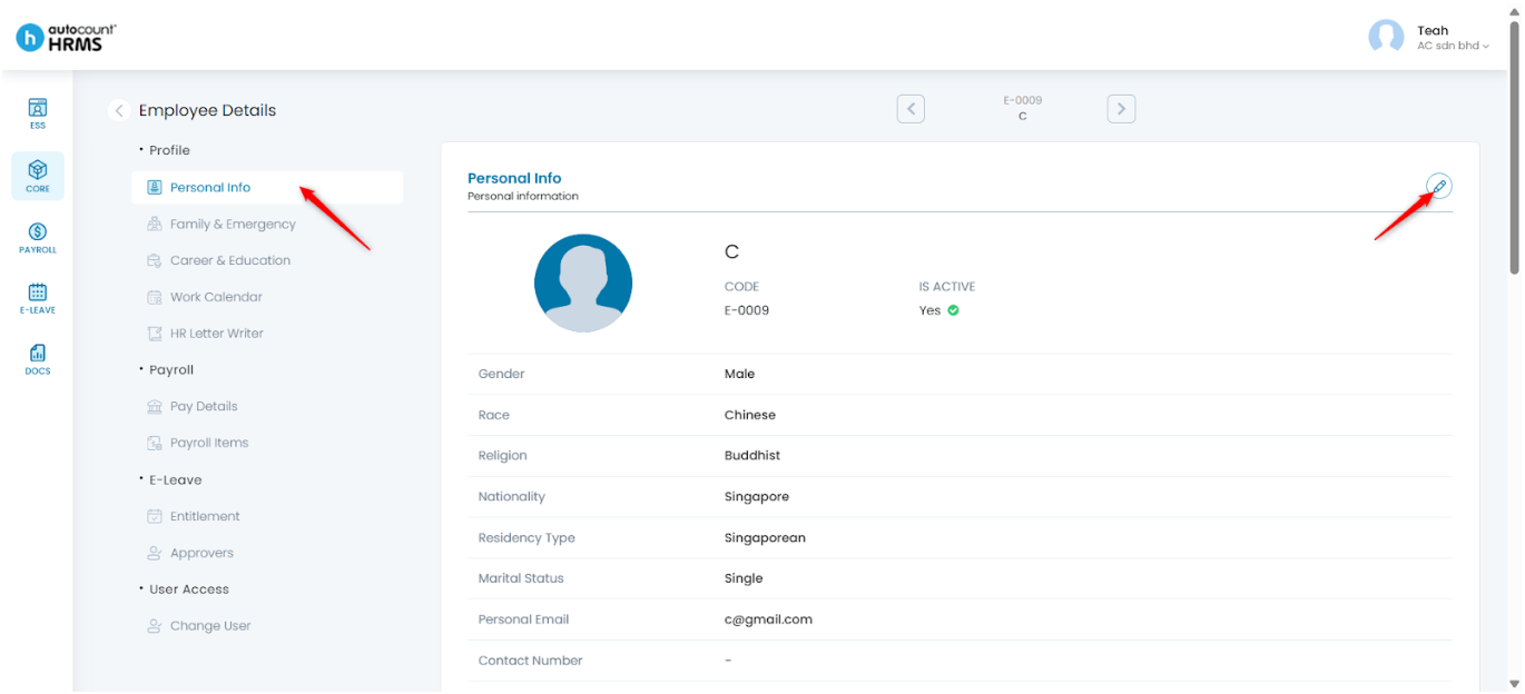 4. Under Employee Details, go to Personal Info and click the pencil icon