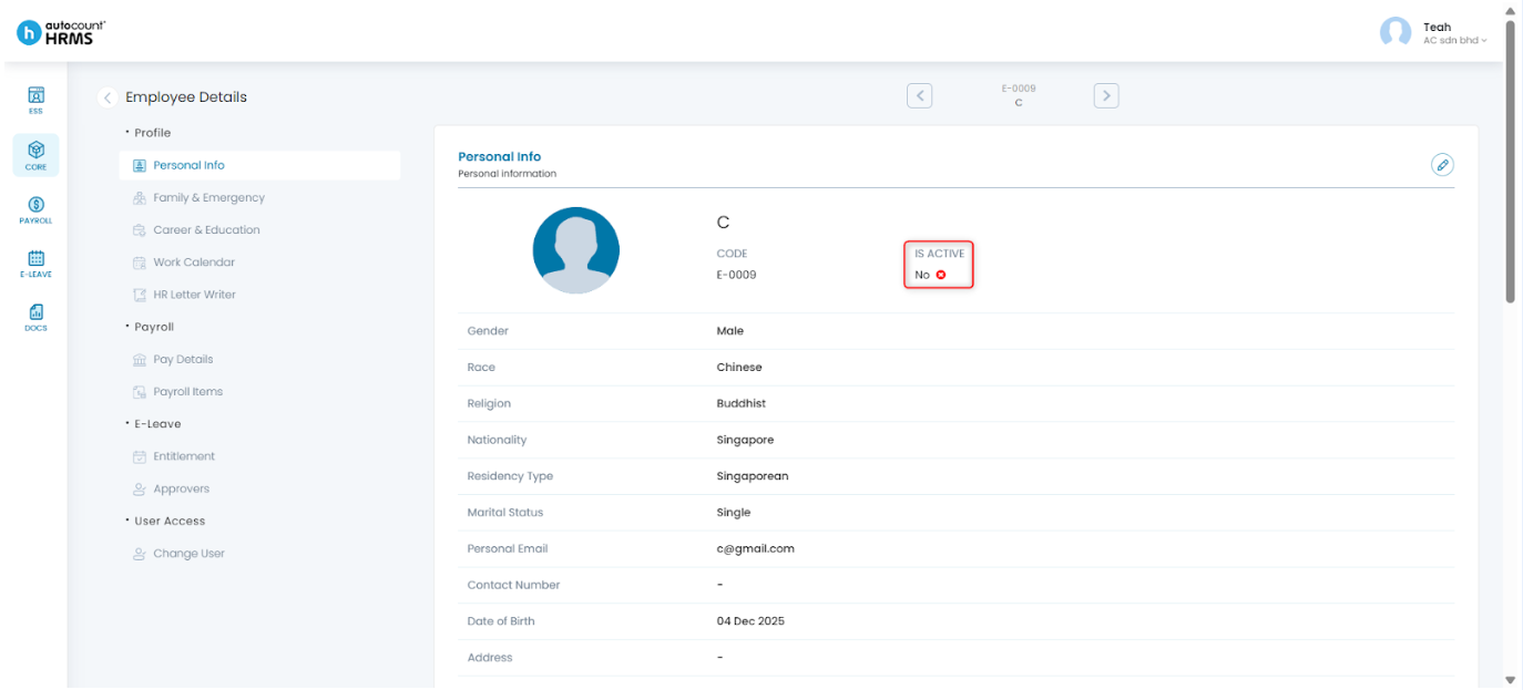 6. The employee will now be marked as inactive and will no longer appear in payroll processing or active employee lists, while historical records remain intact.