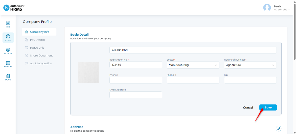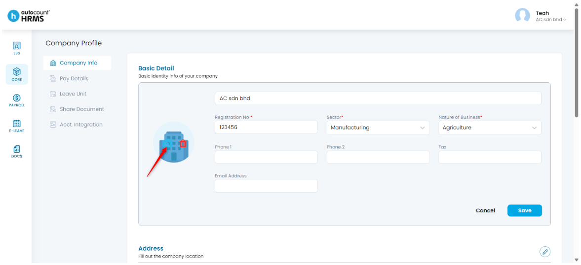 You can upload your company’s logo to AutoCount HRMS at Company > Company Info > Basic Details. The company logo added can be used for report template customisation.