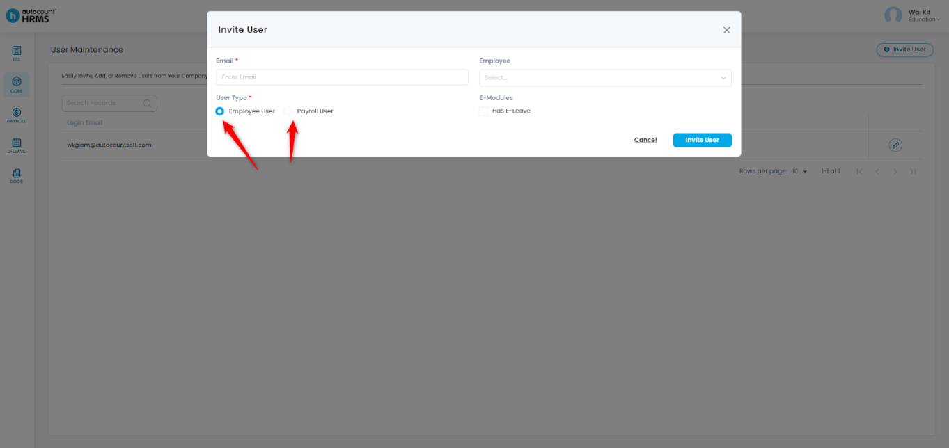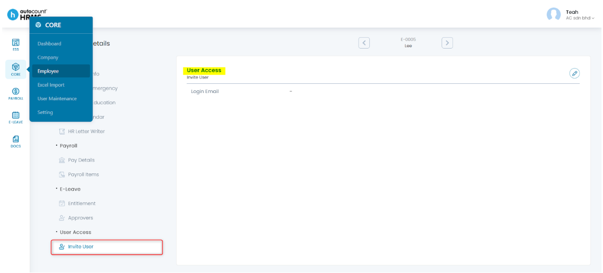 Method 2: Add the employee's email address in User Access for the existing employee record (Core > Employee > locate the employee and click pencil icon).