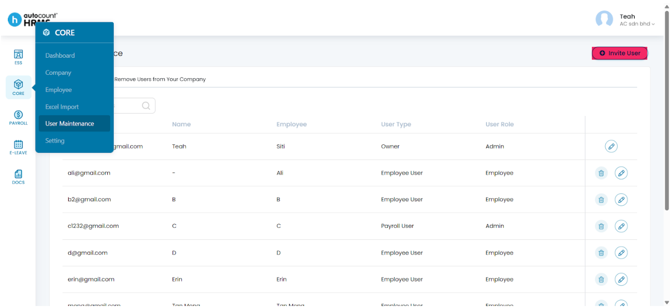 Method 3: Add the employee's email address in User Maintenance (Core > User Maintenance)
